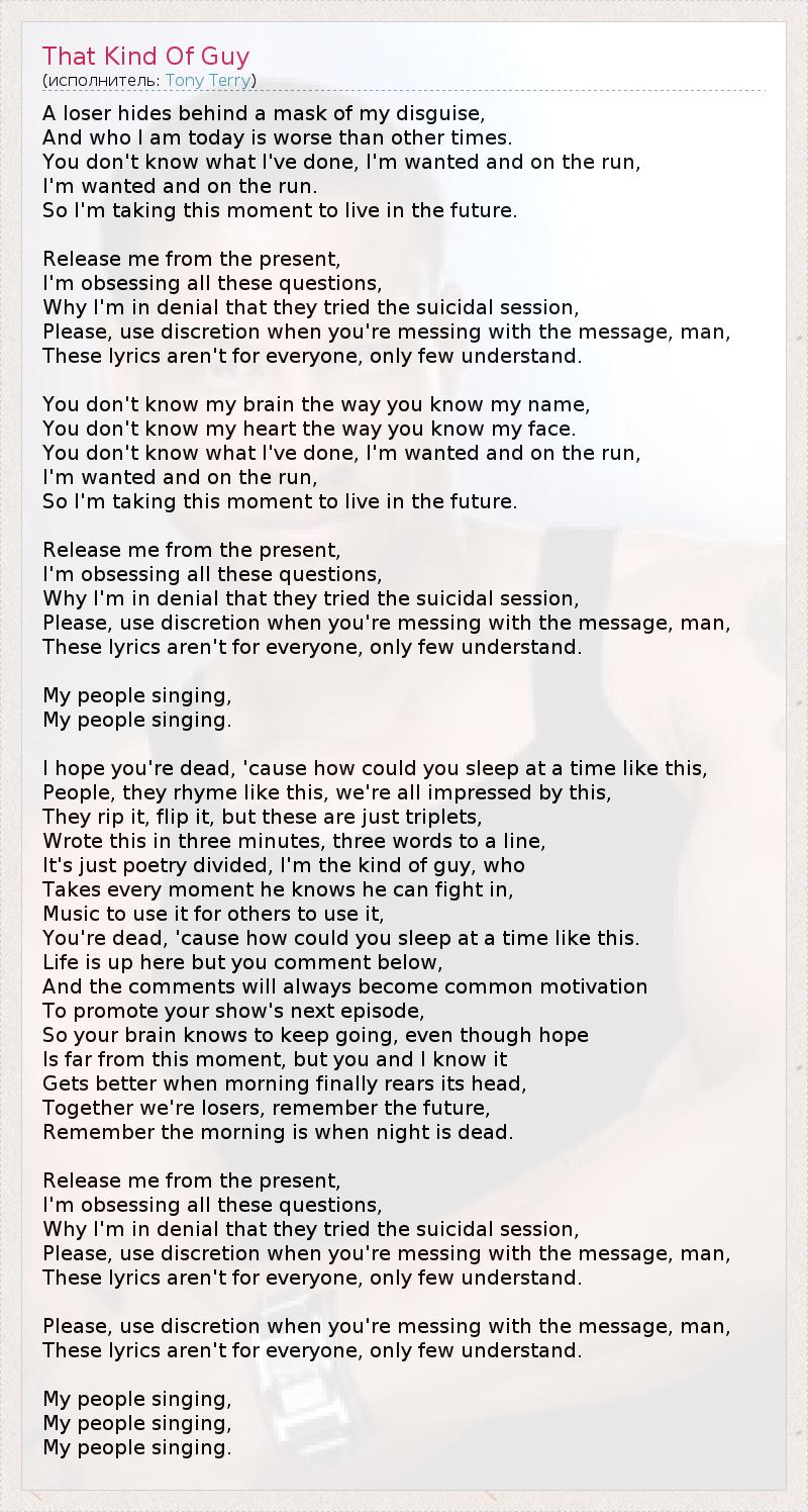 A loser hides behind a mask of my disguise, And who I am today is worse than other times. You don't know what I've done, I'm wanted and on the run, I'm wanted and on the run. So I'm taking this moment to live in the future. Release me from the present, I'm obsessing all these questions, Why I'm in denial that they tried the suicidal session, Please, use discretion when you're messing with the message, man, These lyrics aren't for everyone, only few understand. You don't know my brain the way you know my name, You don't know my heart the way you know my face. You don't know what I've done, I'm wanted and on the run, I'm wanted and on the run, So I'm taking this moment to live in the future. Release me from the present, I'm obsessing all these questions, Why I'm in denial that they tried the suicidal session, Please, use discretion when you're messing with the message, man, These lyrics aren't for everyone, only few understand. My people singing, My people singing. I hope you're dead, 'cause how could you sleep at a time like this, People, they rhyme like this, we're all impressed by this, They rip it, flip it, but these are just triplets, Wrote this in three minutes, three words to a line, It's just poetry divided, I'm the kind of guy, who Takes every moment he knows he can fight in, Music to use it for others to use it, You're dead, 'cause how could you sleep at a time like this. Life is up here but you comment below, And the comments will always become common motivation To promote your show's next episode, So your brain knows to keep going, even though hope Is far from this moment, but you and I know it Gets better when morning finally rears its head, Together we're losers, remember the future, Remember the morning is when night is dead. Release me from the present, I'm obsessing all these questions, Why I'm in denial that they tried the suicidal session, Please, use discretion when you're messing with the message, man, These lyrics aren't for everyone, only few understand. Please, use discretion when you're messing with the message, man, These lyrics aren't for everyone, only few understand. My people singing, My people singing, My people singing.