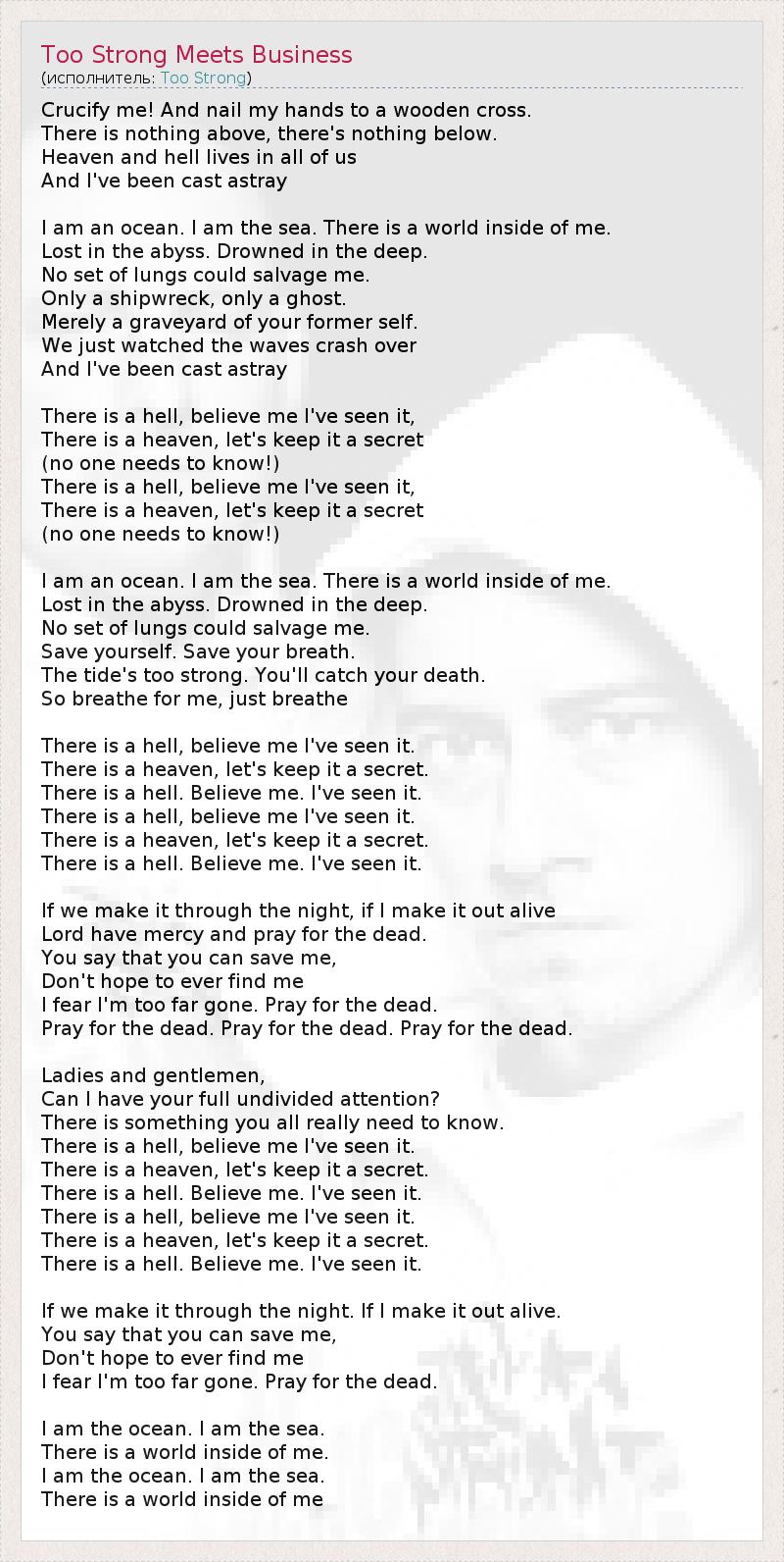 Распни меня! Прибей гвоздями руки мои к деревянному кресту! Ведь нет ни рая, ни ада. Это всё - внутри нас. Я будто выброшен на берег Я – океан. Я – море. Существует мир внутри меня. Мир, потерянный в бездне. Мир, утопленный в самом себе. И ничто меня не спасет. Останется лишь крах, лишь призрак. Только кладбище тебя прошлого, Мы просто смотрели, как разбивались волны. И я будто одна из этих волн, выброшенных на берег. Ад существует, поверьте мне, я сам это видел. Рай существует, давайте держать это в секрете (никому не следует знать!) Ад существует, поверьте мне, я сам это видел. Рай существует, давайте держать это в секрете (никому не следует знать!) Я – океан. Я – море. Существует мир внутри меня. Мир, потерянный в бездне. Мир, утопленный в себе. И ничто его не спасет. Спаси себя. Задержи дыхание. Течение такое сильное. Смерть может забрать тебя. Живи ради меня, просто живи Ад существует, поверьте мне, я сам это видел. Рай существует, давайте держать это в секрете. Ад существует. Поверьте мне. Я это видел. Ад существует. Поверьте мне. Я это видел. Рай существует, давайте держать это в секрете. Ад существует. Поверьте мне. Я это видел Если бы только пережить эту ночь, если бы только я выжил... Господи, помилуй нас и помиолись за умерших, Ты обещал, что спасешь меня, но теперь Даже не надейся, что когда-нибудь увидишь меня. Боюсь, что я зашел слишком далеко. Молись за умерших. Молись за умерших. Молись за умерших. Дамы и господа, Прошу минуточку внимания! У меня есть кое-что, что вам всем следовало бы знать. Ад существует, поверьте мне, я сам это видел. Рай существует, давайте держать это в секрете. Ад существует. Поверьте мне. Я это видел. Ад существует, поверьте мне, я сам это видел. Рай существует, давайте держать это в секрете. Ад существует. Поверьте мне. Я это видел Если бы только пережить эту ночь, если бы только я выжил... Ты обещал, что спасешь меня, но теперь Даже не надейся, что когда-нибудь увидишь меня. Боюсь, что я зашел слишком далеко. Молись за умерших Я – океан. Я – море. Существует мир внутри меня. Я – океан. Я – море. Существует мир внутри меня