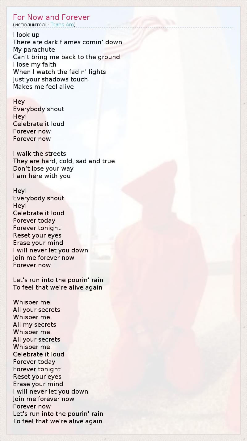 Я поднимаю глаза И вижу, как гаснет тусклое пламя. Мой парашют Не позволяет мне вернуться на землю. Я утрачиваю веру, Когда в моих глазах слабеет свет. Лишь твой мимолетный призрак Заставляет почувствовать, что я еще жив. Эй! Все кричат – Эй! Радуйся громче – Это навсегда, Сейчас и навсегда! Я иду по улицам – Они враждебны, холодны и унылы – такова реальность. Не сбивайся со своего пути, Я здесь, я с тобой. Эй! Все кричат – Эй! Радуйся громче. Этот день – навечно, Эта ночь – навечно. Открой глаза вновь, Сотри из памяти прошлое. Я никогда не разочарую тебя, Будь со мной навсегда, Сейчас и навсегда... Мы бежим под проливным дождем, Чтобы снова ощутить жизнь. Шепни мне Все свои тайны, Шепни мне Все мои тайны, Шепни мне Все свои тайны, Шепни мне, Радуйся громче. Этот день – навечно, Эта ночь – навечно. Открой глаза вновь, Сотри из памяти прошлое. Я никогда не разочарую тебя, Будь со мной навсегда, Сейчас и навсегда. Мы бежим под проливным дождем, Чтобы снова ощутить жизнь…