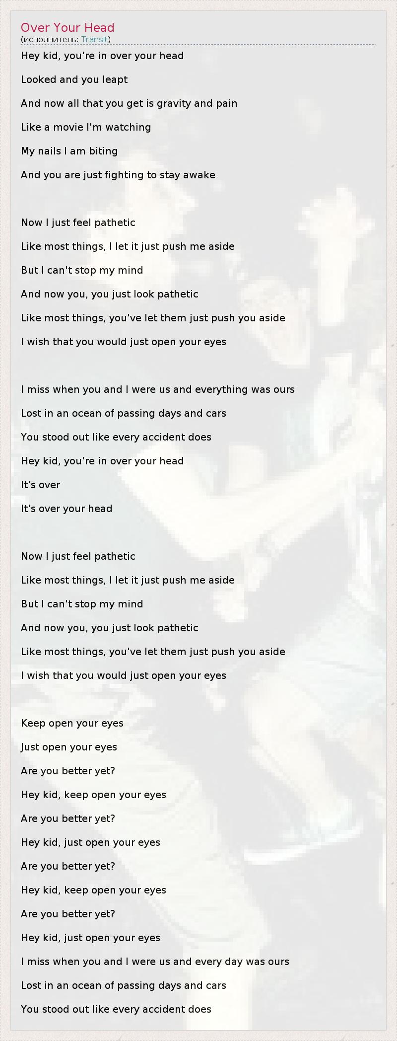 Hey kid, you're in over your head Looked and you leapt And now all that you get is gravity and pain Like a movie I'm watching My nails I am biting And you are just fighting to stay awake Now I just feel pathetic Like most things, I let it just push me aside But I can't stop my mind And now you, you just look pathetic Like most things, you've let them just push you aside I wish that you would just open your eyes I miss when you and I were us and everything was ours Lost in an ocean of passing days and cars You stood out like every accident does Hey kid, you're in over your head It's over It's over your head Now I just feel pathetic Like most things, I let it just push me aside But I can't stop my mind And now you, you just look pathetic Like most things, you've let them just push you aside I wish that you would just open your eyes Keep open your eyes Just open your eyes Are you better yet? Hey kid, keep open your eyes Are you better yet? Hey kid, just open your eyes Are you better yet? Hey kid, keep open your eyes Are you better yet? Hey kid, just open your eyes I miss when you and I were us and every day was ours Lost in an ocean of passing days and cars You stood out like every accident does