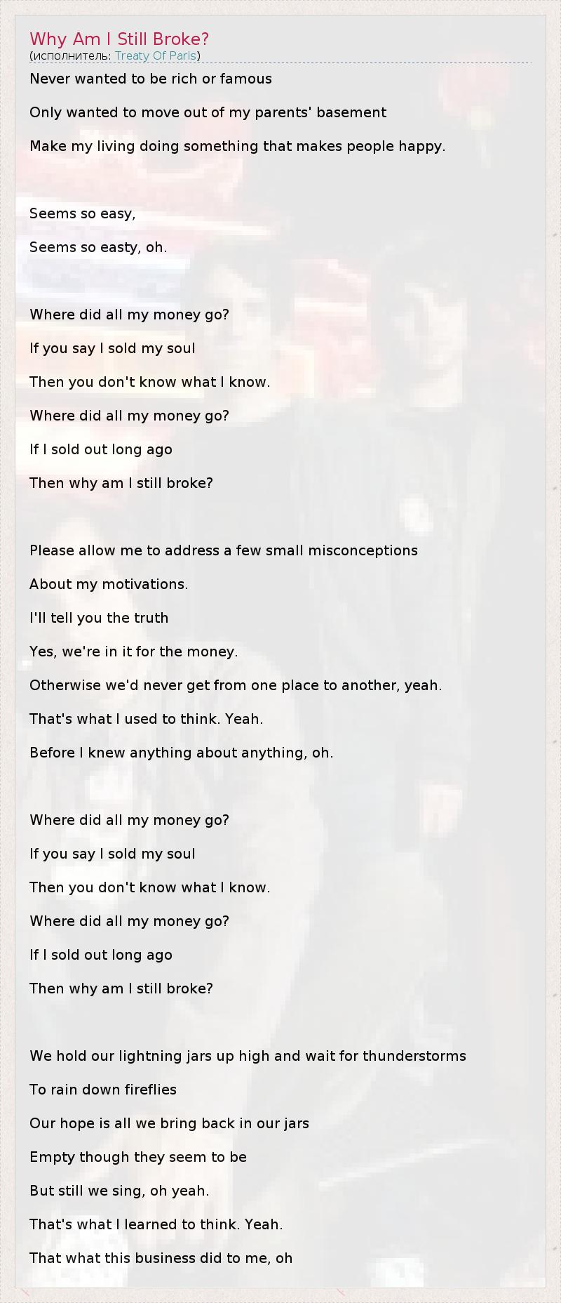 А как ты думаешь, о чем песня "Why Am I Still Broke?" ?
