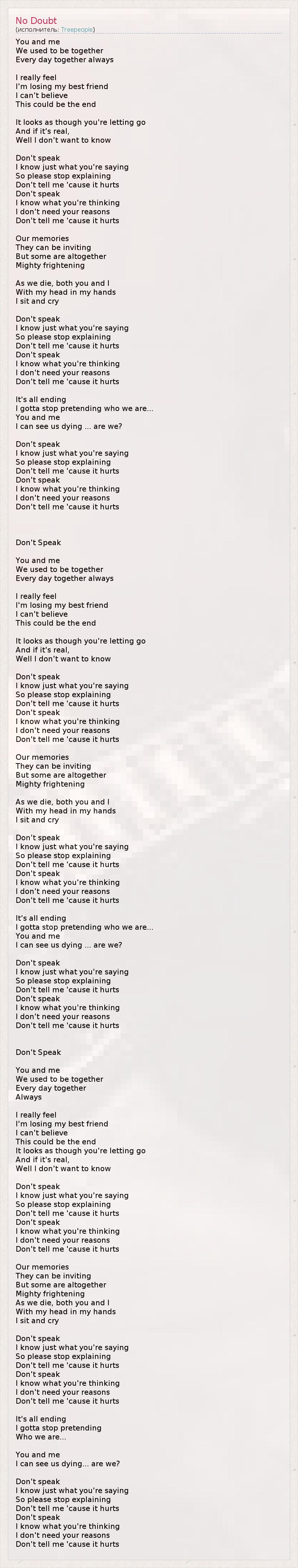 You and me We used to be together Every day together always I really feel I'm losing my best friend I can't believe This could be the end It looks as though you're letting go And if it's real, Well I don't want to know Don't speak I know just what you're saying So please stop explaining Don't tell me 'cause it hurts Don't speak I know what you're thinking I don't need your reasons Don't tell me 'cause it hurts Our memories They can be inviting But some are altogether Mighty frightening As we die, both you and I With my head in my hands I sit and cry Don't speak I know just what you're saying So please stop explaining Don't tell me 'cause it hurts Don't speak I know what you're thinking I don't need your reasons Don't tell me 'cause it hurts It's all ending I gotta stop pretending who we are... You and me I can see us dying ... are we? Don't speak I know just what you're saying So please stop explaining Don't tell me 'cause it hurts Don't speak I know what you're thinking I don't need your reasons Don't tell me 'cause it hurts Don't Speak You and me We used to be together Every day together always I really feel I'm losing my best friend I can't believe This could be the end It looks as though you're letting go And if it's real, Well I don't want to know Don't speak I know just what you're saying So please stop explaining Don't tell me 'cause it hurts Don't speak I know what you're thinking I don't need your reasons Don't tell me 'cause it hurts Our memories They can be inviting But some are altogether Mighty frightening As we die, both you and I With my head in my hands I sit and cry Don't speak I know just what you're saying So please stop explaining Don't tell me 'cause it hurts Don't speak I know what you're thinking I don't need your reasons Don't tell me 'cause it hurts It's all ending I gotta stop pretending who we are... You and me I can see us dying ... are we? Don't speak I know just what you're saying So please stop explaining Don't tell me 'cause it hurts Don't speak I know what you're thinking I don't need your reasons Don't tell me 'cause it hurts Don't Speak You and me We used to be together Every day together Always I really feel I'm losing my best friend I can't believe This could be the end It looks as though you're letting go And if it's real, Well I don't want to know Don't speak I know just what you're saying So please stop explaining Don't tell me 'cause it hurts Don't speak I know what you're thinking I don't need your reasons Don't tell me 'cause it hurts Our memories They can be inviting But some are altogether Mighty frightening As we die, both you and I With my head in my hands I sit and cry Don't speak I know just what you're saying So please stop explaining Don't tell me 'cause it hurts Don't speak I know what you're thinking I don't need your reasons Don't tell me 'cause it hurts It's all ending I gotta stop pretending Who we are... You and me I can see us dying... are we? Don't speak I know just what you're saying So please stop explaining Don't tell me 'cause it hurts Don't speak I know what you're thinking I don't need your reasons Don't tell me 'cause it hurts