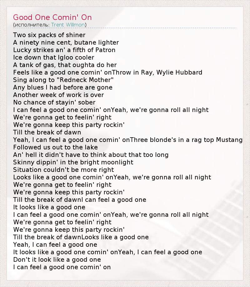 Two six packs of shiner A ninety nine cent, butane lighter Lucky strikes an' a fifth of Patron Ice down that Igloo cooler A tank of gas, that oughta do her Feels like a good one comin' onThrow in Ray, Wylie Hubbard Sing along to "Redneck Mother" Any blues I had before are gone Another week of work is over No chance of stayin' sober I can feel a good one comin' onYeah, we're gonna roll all night We're gonna get to feelin' right We're gonna keep this party rockin' Till the break of dawn Yeah, I can feel a good one comin' onThree blonde's in a rag top Mustang Followed us out to the lake An' hell it didn't have to think about that too long Skinny dippin' in the bright moonlight Situation couldn't be more right Looks like a good one comin' onYeah, we're gonna roll all night We're gonna get to feelin' right We're gonna keep this party rockin' Till the break of dawnI can feel a good one It looks like a good one I can feel a good one comin' onYeah, we're gonna roll all night We're gonna get to feelin' right We're gonna keep this party rockin' Till the break of dawnLooks like a good one Yeah, I can feel a good one It looks like a good one comin' onYeah, I can feel a good one Don't it look like a good one I can feel a good one comin' on