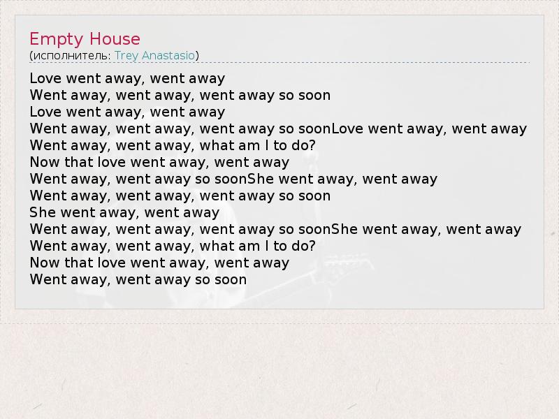 Love went away, went away Went away, went away, went away so soon Love went away, went away Went away, went away, went away so soonLove went away, went away Went away, went away, what am I to do? Now that love went away, went away Went away, went away so soonShe went away, went away Went away, went away, went away so soon She went away, went away Went away, went away, went away so soonShe went away, went away Went away, went away, what am I to do? Now that love went away, went away Went away, went away so soon