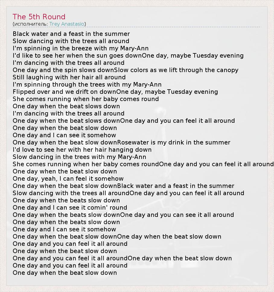Black water and a feast in the summer Slow dancing with the trees all around I'm spinning in the breeze with my Mary-Ann I'd like to see her when the sun goes downOne day, maybe Tuesday evening I'm dancing with the trees all around One day and the spin slows downSlow colors as we lift through the canopy Still laughing with her hair all around I'm spinning through the trees with my Mary-Ann Flipped over and we drift on downOne day, maybe Tuesday evening She comes running when her baby comes round One day when the beat slows down I'm dancing with the trees all around One day when the beat slows downOne day and you can feel it all around One day when the beat slow down One day and I can see it somehow One day when the beat slow downRosewater is my drink in the summer I'd love to see her with her hair hanging down Slow dancing in the trees with my Mary-Ann She comes running when her baby comes roundOne day and you can feel it all around One day when the beat slow down One day, yeah, I can feel it somehow One day when the beat slow downBlack water and a feast in the summer Slow dancing with the trees all aroundOne day and you can feel it all around One day when the beats slow down One day and I can see it comin' round One day when the beats slow downOne day and you can see it all around One day when the beats slow down One day and I can see it somehow One day when the beat slow downOne day when the beat slow down One day and you can feel it all around One day when the beat slow down One day and you can feel it all aroundOne day when the beat slow down One day and you can feel it all around One day when the beat slow down