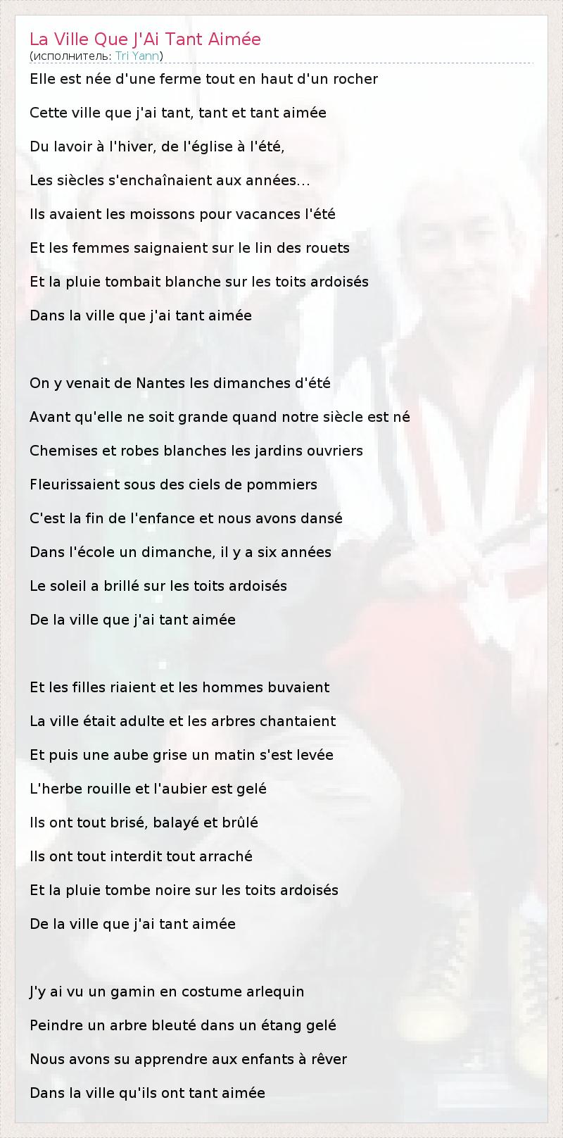 Elle est née d'une ferme tout en haut d'un rocher Cette ville que j'ai tant, tant et tant aimée Du lavoir à l'hiver, de l'église à l'été, Les siècles s'enchaînaient aux années… Ils avaient les moissons pour vacances l'été Et les femmes saignaient sur le lin des rouets Et la pluie tombait blanche sur les toits ardoisés Dans la ville que j'ai tant aimée On y venait de Nantes les dimanches d'été Avant qu'elle ne soit grande quand notre siècle est né Chemises et robes blanches les jardins ouvriers Fleurissaient sous des ciels de pommiers C'est la fin de l'enfance et nous avons dansé Dans l'école un dimanche, il y a six années Le soleil a brillé sur les toits ardoisés De la ville que j'ai tant aimée Et les filles riaient et les hommes buvaient La ville était adulte et les arbres chantaient Et puis une aube grise un matin s'est levée L'herbe rouille et l'aubier est gelé Ils ont tout brisé, balayé et brûlé Ils ont tout interdit tout arraché Et la pluie tombe noire sur les toits ardoisés De la ville que j'ai tant aimée J'y ai vu un gamin en costume arlequin Peindre un arbre bleuté dans un étang gelé Nous avons su apprendre aux enfants à rêver Dans la ville qu'ils ont tant aimée