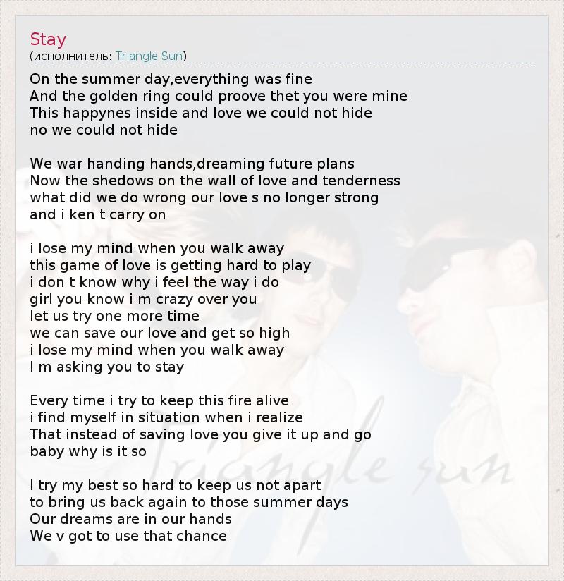 On the summer day,everything was fine And the golden ring could proove thet you were mine This happynes inside and love we could not hide no we could not hide We war handing hands,dreaming future plans Now the shedows on the wall of love and tenderness what did we do wrong our love s no longer strong and i ken t carry on i lose my mind when you walk away this game of love is getting hard to play i don t know why i feel the way i do girl you know i m crazy over you let us try one more time we can save our love and get so high i lose my mind when you walk away I m asking you to stay Every time i try to keep this fire alive i find myself in situation when i realize That instead of saving love you give it up and go baby why is it so I try my best so hard to keep us not apart to bring us back again to those summer days Our dreams are in our hands We v got to use that chance