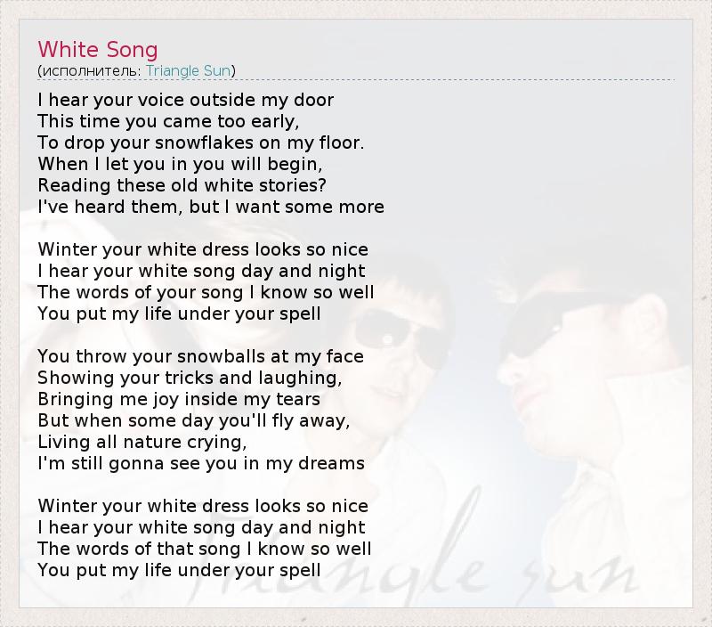 Я слышу твой голос за своей дверью. В этот раз ты пришла так рано Разбросать снежинки на моем полу. Если я тебя впущу, прочтешь ли ты Все эти давние белые истории? Я уже слышал их, но я хочу еще. Зима, твой белый наряд выглядит так мило. Я слышу твою белую песню день и ночь. Слова той песни я прекрасно знаю. Ты околдовала мою жизнь. Ты кидаешь снежки мне прямо в лицо, Показываешь свои фокусы и смеешься, Приносишь мне радость взамен моих слез, Но когда однажды ты улетишь, Оставив все природу в слезах, Я еще долго буду видеть тебя во сне. Зима, твой белый наряд выглядит так мило. Я слышу твою белую песню день и ночь. Слова той песни я прекрасно знаю. Ты околдовала мою жизнь.
