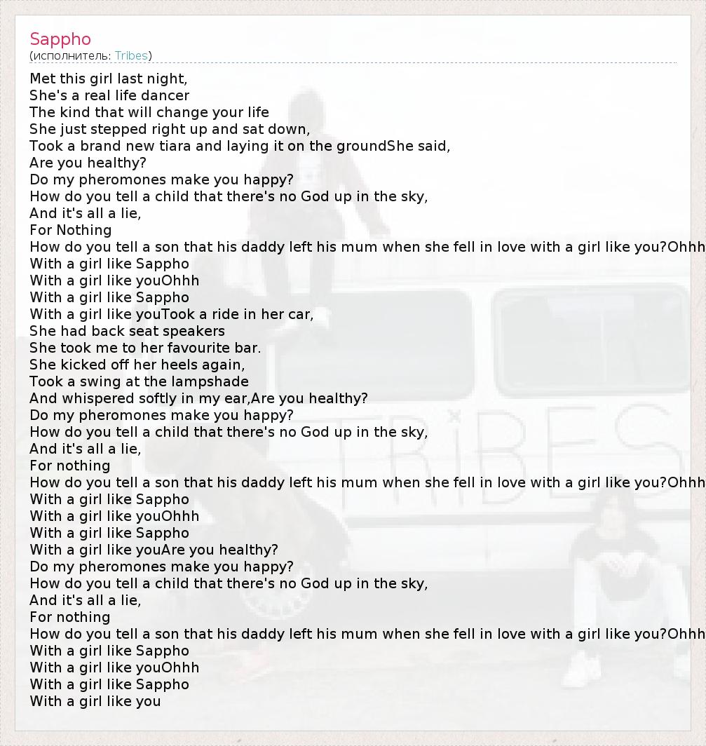 Met this girl last night, She's a real life dancer The kind that will change your life She just stepped right up and sat down, Took a brand new tiara and laying it on the groundShe said, Are you healthy? Do my pheromones make you happy? How do you tell a child that there's no God up in the sky, And it's all a lie, For Nothing How do you tell a son that his daddy left his mum when she fell in love with a girl like you?Ohhh With a girl like Sappho With a girl like youOhhh With a girl like Sappho With a girl like youTook a ride in her car, She had back seat speakers She took me to her favourite bar. She kicked off her heels again, Took a swing at the lampshade And whispered softly in my ear,Are you healthy? Do my pheromones make you happy? How do you tell a child that there's no God up in the sky, And it's all a lie, For nothing How do you tell a son that his daddy left his mum when she fell in love with a girl like you?Ohhh With a girl like Sappho With a girl like youOhhh With a girl like Sappho With a girl like youAre you healthy? Do my pheromones make you happy? How do you tell a child that there's no God up in the sky, And it's all a lie, For nothing How do you tell a son that his daddy left his mum when she fell in love with a girl like you?Ohhh With a girl like Sappho With a girl like youOhhh With a girl like Sappho With a girl like you