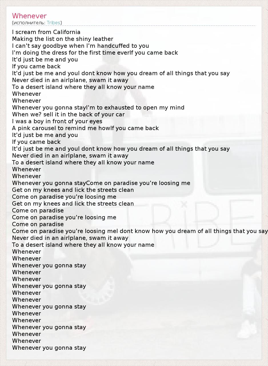 I scream from California Making the list on the shiny leather I can't say goodbye when I'm handcuffed to you I'm doing the dress for the first time everIf you came back It'd just be me and you If you came back It'd just be me and youI dont know how you dream of all things that you say Never died in an airlplane, swam it away To a desert island where they all know your name Whenever Whenever Whenever you gonna stayI'm to exhausted to open my mind When we? sell it in the back of your car I was a boy in front of your eyes A pink carousel to remind me howIf you came back It'd just be me and you If you came back It'd just be me and youI dont know how you dream of all things that you say Never died in an airlplane, swam it away To a desert island where they all know your name Whenever Whenever Whenever you gonna stayCome on paradise you're loosing me Get on my knees and lick the streets clean Come on paradise you're loosing me Get on my knees and lick the streets clean Come on paradise Come on paradise you're loosing me Come on paradise Come on paradise you're loosing meI dont know how you dream of all things that you say Never died in an airlplane, swam it away To a desert island where they all know your name Whenever Whenever Whenever you gonna stay Whenever Whenever Whenever you gonna stay Whenever Whenever Whenever you gonna stay Whenever Whenever Whenever you gonna stay Whenever Whenever Whenever you gonna stay