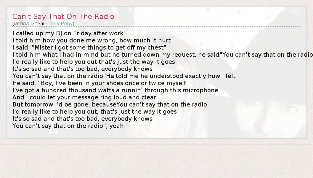 А как ты думаешь, о чем песня "Can't Say That On The Radio" ?
