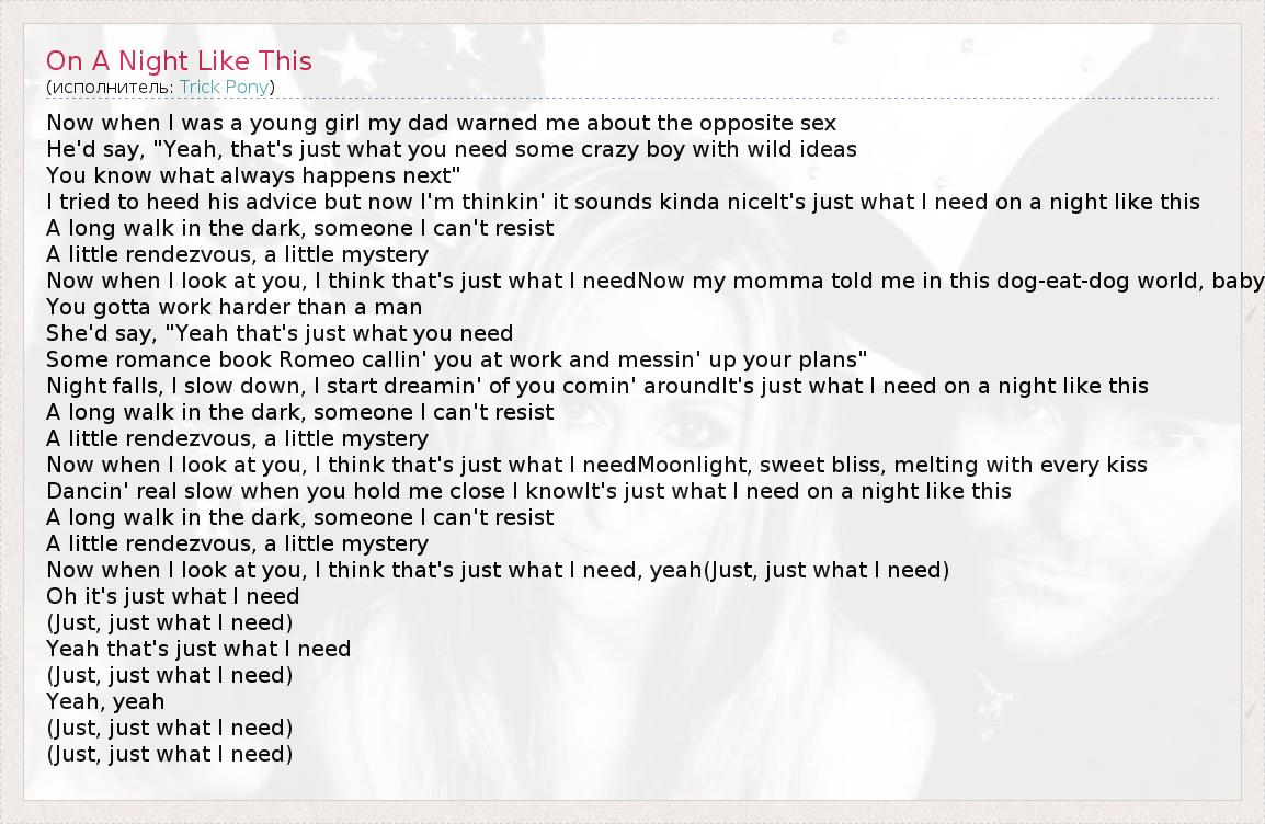 Now when I was a young girl my dad warned me about the opposite sex He'd say, "Yeah, that's just what you need some crazy boy with wild ideas You know what always happens next" I tried to heed his advice but now I'm thinkin' it sounds kinda niceIt's just what I need on a night like this A long walk in the dark, someone I can't resist A little rendezvous, a little mystery Now when I look at you, I think that's just what I needNow my momma told me in this dog-eat-dog world, baby You gotta work harder than a man She'd say, "Yeah that's just what you need Some romance book Romeo callin' you at work and messin' up your plans" Night falls, I slow down, I start dreamin' of you comin' aroundIt's just what I need on a night like this A long walk in the dark, someone I can't resist A little rendezvous, a little mystery Now when I look at you, I think that's just what I needMoonlight, sweet bliss, melting with every kiss Dancin' real slow when you hold me close I knowIt's just what I need on a night like this A long walk in the dark, someone I can't resist A little rendezvous, a little mystery Now when I look at you, I think that's just what I need, yeah(Just, just what I need) Oh it's just what I need (Just, just what I need) Yeah that's just what I need (Just, just what I need) Yeah, yeah (Just, just what I need) (Just, just what I need)