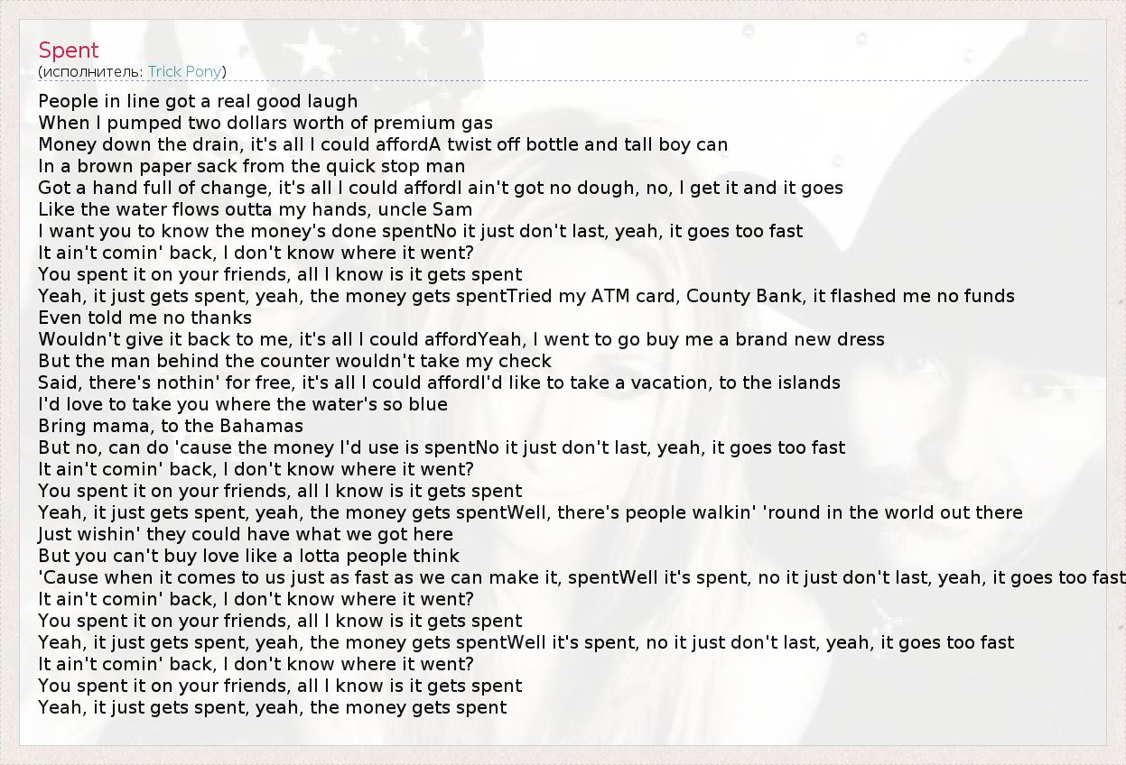 People in line got a real good laugh When I pumped two dollars worth of premium gas Money down the drain, it's all I could affordA twist off bottle and tall boy can In a brown paper sack from the quick stop man Got a hand full of change, it's all I could affordI ain't got no dough, no, I get it and it goes Like the water flows outta my hands, uncle Sam I want you to know the money's done spentNo it just don't last, yeah, it goes too fast It ain't comin' back, I don't know where it went? You spent it on your friends, all I know is it gets spent Yeah, it just gets spent, yeah, the money gets spentTried my ATM card, County Bank, it flashed me no funds Even told me no thanks Wouldn't give it back to me, it's all I could affordYeah, I went to go buy me a brand new dress But the man behind the counter wouldn't take my check Said, there's nothin' for free, it's all I could affordI'd like to take a vacation, to the islands I'd love to take you where the water's so blue Bring mama, to the Bahamas But no, can do 'cause the money I'd use is spentNo it just don't last, yeah, it goes too fast It ain't comin' back, I don't know where it went? You spent it on your friends, all I know is it gets spent Yeah, it just gets spent, yeah, the money gets spentWell, there's people walkin' 'round in the world out there Just wishin' they could have what we got here But you can't buy love like a lotta people think 'Cause when it comes to us just as fast as we can make it, spentWell it's spent, no it just don't last, yeah, it goes too fast It ain't comin' back, I don't know where it went? You spent it on your friends, all I know is it gets spent Yeah, it just gets spent, yeah, the money gets spentWell it's spent, no it just don't last, yeah, it goes too fast It ain't comin' back, I don't know where it went? You spent it on your friends, all I know is it gets spent Yeah, it just gets spent, yeah, the money gets spent