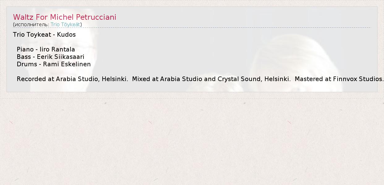 ГлавнаяИсполнителиTrio TöykeätWaltz For Michel Petrucciani