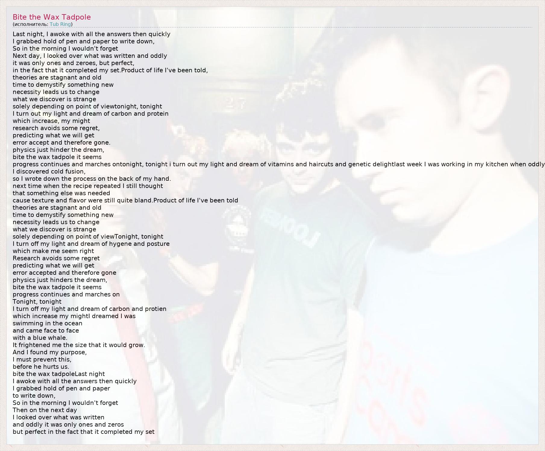 А как ты думаешь, о чем песня "Bite the Wax Tadpole" ?