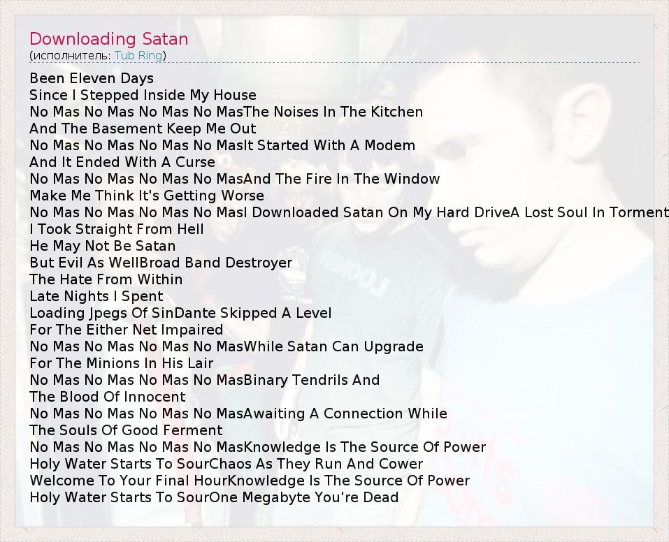 Been Eleven Days Since I Stepped Inside My House No Mas No Mas No Mas No MasThe Noises In The Kitchen And The Basement Keep Me Out No Mas No Mas No Mas No MasIt Started With A Modem And It Ended With A Curse No Mas No Mas No Mas No MasAnd The Fire In The Window Make Me Think It's Getting Worse No Mas No Mas No Mas No MasI Downloaded Satan On My Hard DriveA Lost Soul In Torment I Took Straight From Hell He May Not Be Satan But Evil As WellBroad Band Destroyer The Hate From Within Late Nights I Spent Loading Jpegs Of SinDante Skipped A Level For The Either Net Impaired No Mas No Mas No Mas No MasWhile Satan Can Upgrade For The Minions In His Lair No Mas No Mas No Mas No MasBinary Tendrils And The Blood Of Innocent No Mas No Mas No Mas No MasAwaiting A Connection While The Souls Of Good Ferment No Mas No Mas No Mas No MasKnowledge Is The Source Of Power Holy Water Starts To SourChaos As They Run And Cower Welcome To Your Final HourKnowledge Is The Source Of Power Holy Water Starts To SourOne Megabyte You're Dead