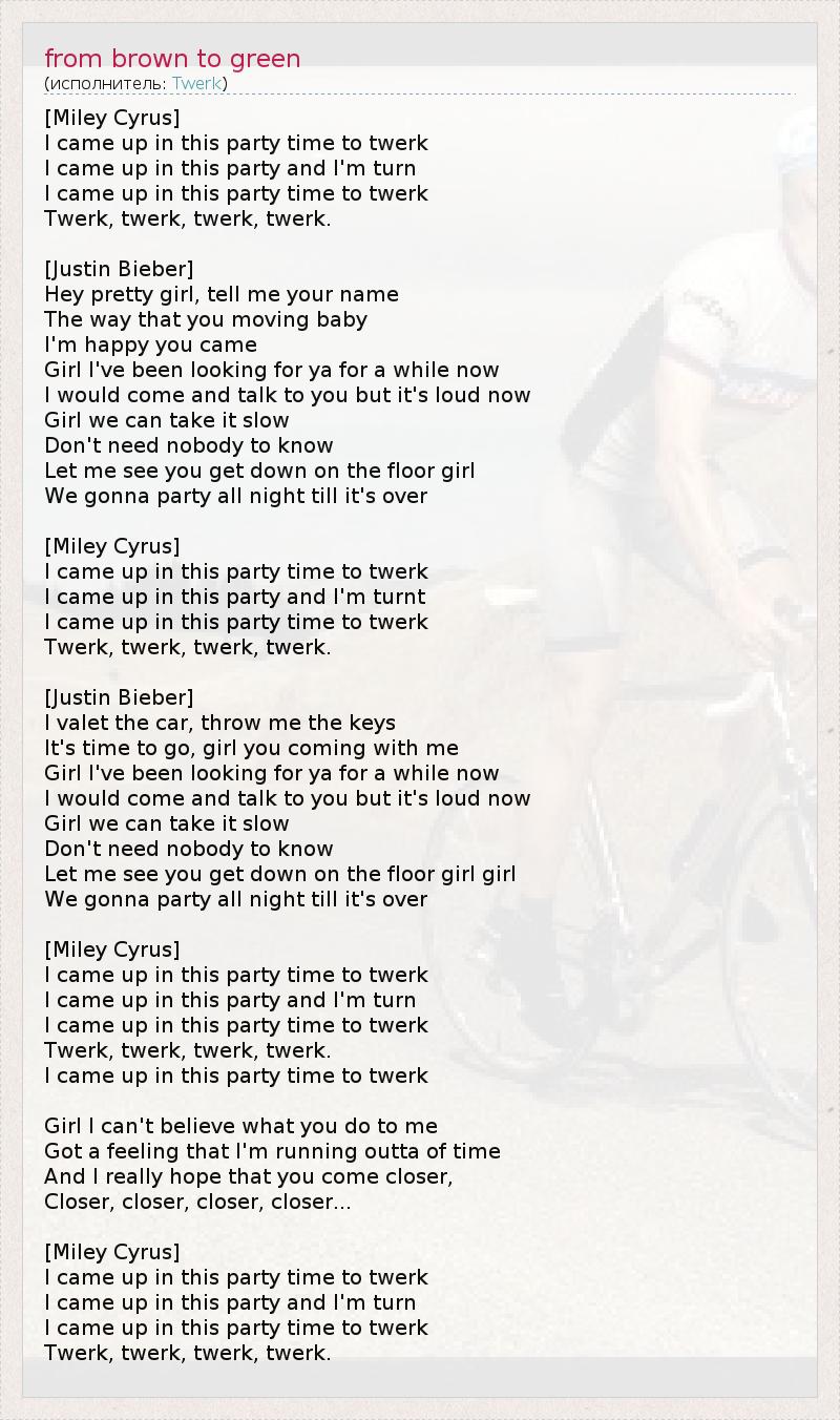 [Miley Cyrus] I came up in this party time to twerk I came up in this party and I'm turn I came up in this party time to twerk Twerk, twerk, twerk, twerk. [Justin Bieber] Hey pretty girl, tell me your name The way that you moving baby I'm happy you came Girl I've been looking for ya for a while now I would come and talk to you but it's loud now Girl we can take it slow Don't need nobody to know Let me see you get down on the floor girl We gonna party all night till it's over [Miley Cyrus] I came up in this party time to twerk I came up in this party and I'm turnt I came up in this party time to twerk Twerk, twerk, twerk, twerk. [Justin Bieber] I valet the car, throw me the keys It's time to go, girl you coming with me Girl I've been looking for ya for a while now I would come and talk to you but it's loud now Girl we can take it slow Don't need nobody to know Let me see you get down on the floor girl girl We gonna party all night till it's over [Miley Cyrus] I came up in this party time to twerk I came up in this party and I'm turn I came up in this party time to twerk Twerk, twerk, twerk, twerk. I came up in this party time to twerk Girl I can't believe what you do to me Got a feeling that I'm running outta of time And I really hope that you come closer, Closer, closer, closer, closer... [Miley Cyrus] I came up in this party time to twerk I came up in this party and I'm turn I came up in this party time to twerk Twerk, twerk, twerk, twerk.