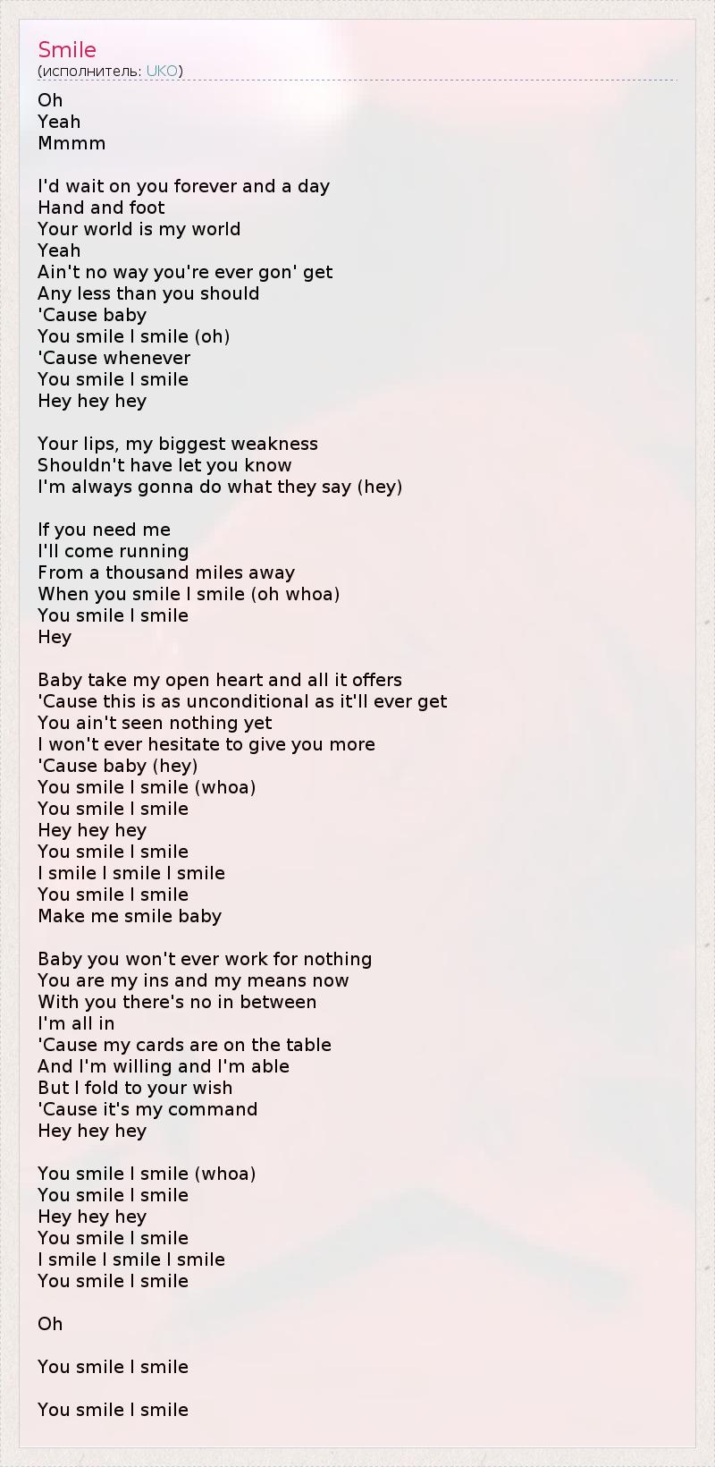 О-о, Да-а, М-м-м-м. Я буду ждать тебя всегда, каждый день, Усердно. Твой мир – мой мир. Да-а. По-любому ты никогда не получишь Меньше, чем тебе положено, Потому что, малыш, Улыбаешься ты - улыбаюсь и я (о-о). Потому что всегда, когда Улыбаешься ты, улыбаюсь и я. Эй, эй, эй! Твои губы – моя самая большая слабость, Мне не следовало тебе говорить, Что я всегда буду делать то, что они скажут (эй!). Если я нужен тебе, То я прибегу, Даже если буду за тысячу миль от тебя. Когда ты улыбаешься – я улыбаюсь (о-о, уоу), Ты улыбаешься – я улыбаюсь. Эй! Малыш, прими моё открытое сердце и всё, что оно предлагает, Потому что моя любовь безусловна - чище чувства быть не может, Ты просто ещё ничего не заметила. Я, не колеблясь, всегда дам тебе больше, Потому что, малыш (Эй!), Улыбаешься ты - улыбаюсь и я (уоу), Улыбаешься ты - улыбаюсь и я. Эй, эй, эй! Улыбаешься ты - улыбаюсь и я, Я улыбаюсь, я улыбаюсь, я улыбаюсь. Улыбаешься ты - улыбаюсь и я, Вызови улыбку на моём лице, малыш! Малыш, ты никогда не будешь работать за копейки. Ты сейчас мой доход, моё богатство, С тобой нет ничего промежуточного - Я весь твой, Потому мои карты открыты. Я хочу и могу, Но я подчиняюсь твоему желанию, Потому что оно приказ для меня. Эй, эй, эй! Улыбаешься ты - улыбаюсь и я (уоу), Улыбаешься ты - улыбаюсь и я. Эй, эй, эй! Улыбаешься ты - улыбаюсь и я, Я улыбаюсь, я улыбаюсь, я улыбаюсь. Улыбаешься ты - улыбаюсь и я. О-о. Улыбаешься ты - улыбаюсь и я, Улыбаешься ты - улыбаюсь и я.