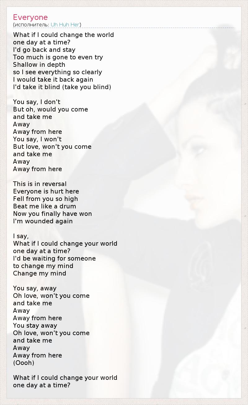 What if I could change the world one day at a time? I'd go back and stay Too much is gone to even try Shallow in depth so I see everything so clearly I would take it back again I'd take it blind (take you blind) You say, I don't But oh, would you come and take me Away Away from here You say, I won't But love, won't you come and take me Away Away from here This is in reversal Everyone is hurt here Fell from you so high Beat me like a drum Now you finally have won I'm wounded again I say, What if I could change your world one day at a time? I'd be waiting for someone to change my mind Change my mind You say, away Oh love, won't you come and take me Away Away from here You stay away Oh love, won't you come and take me Away Away from here (Oooh) What if I could change your world one day at a time?