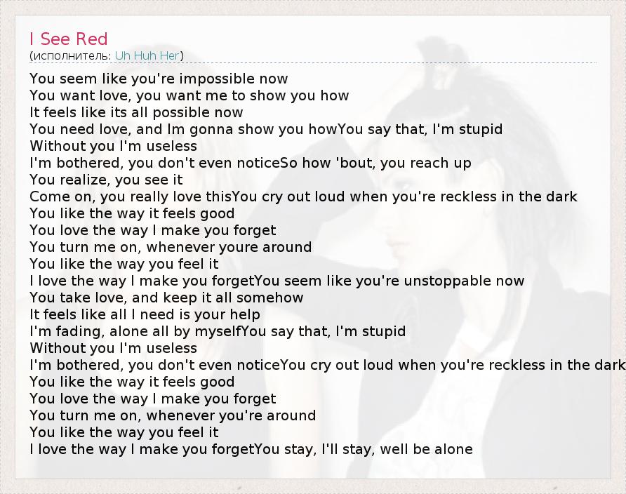 You seem like you're impossible now You want love, you want me to show you how It feels like its all possible now You need love, and Im gonna show you howYou say that, I'm stupid Without you I'm useless I'm bothered, you don't even noticeSo how 'bout, you reach up You realize, you see it Come on, you really love thisYou cry out loud when you're reckless in the dark You like the way it feels good You love the way I make you forget You turn me on, whenever youre around You like the way you feel it I love the way I make you forgetYou seem like you're unstoppable now You take love, and keep it all somehow It feels like all I need is your help I'm fading, alone all by myselfYou say that, I'm stupid Without you I'm useless I'm bothered, you don't even noticeYou cry out loud when you're reckless in the dark You like the way it feels good You love the way I make you forget You turn me on, whenever you're around You like the way you feel it I love the way I make you forgetYou stay, I'll stay, well be alone