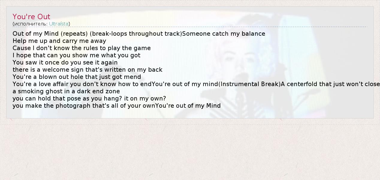 Out of my Mind (repeats) (break-loops throughout track)Someone catch my balance Help me up and carry me away Cause I don't know the rules to play the game I hope that can you show me what you got You saw it once do you see it again there is a welcome sign that's written on my back You're a blown out hole that just got mend You're a love affair you don't know how to endYou're out of my mind(Instrumental Break)A centerfold that just won't close a smoking ghost in a dark end zone you can hold that pose as you hang? it on my own? you make the photograph that's all of your ownYou're out of my Mind