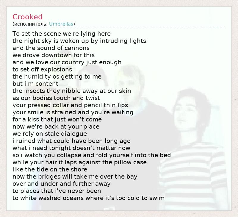 To set the scene we're lying here the night sky is woken up by intruding lights and the sound of cannons we drove downtown for this and we love our country just enough to set off explosions the humidity os getting to me but i'm content the insects they nibble away at our skin as our bodies touch and twist your pressed collar and pencil thin lips your smile is strained and you're waiting for a kiss that just won't come now we're back at your place we rely on stale dialogue i ruined what could have been long ago what i need tonight doesn't matter now so i watch you collapse and fold yourself into the bed while your hair it laps against the pillow case like the tide on the shore now the bridges will take me over the bay over and under and further away to places that i've never been to white washed oceans where it's too cold to swim