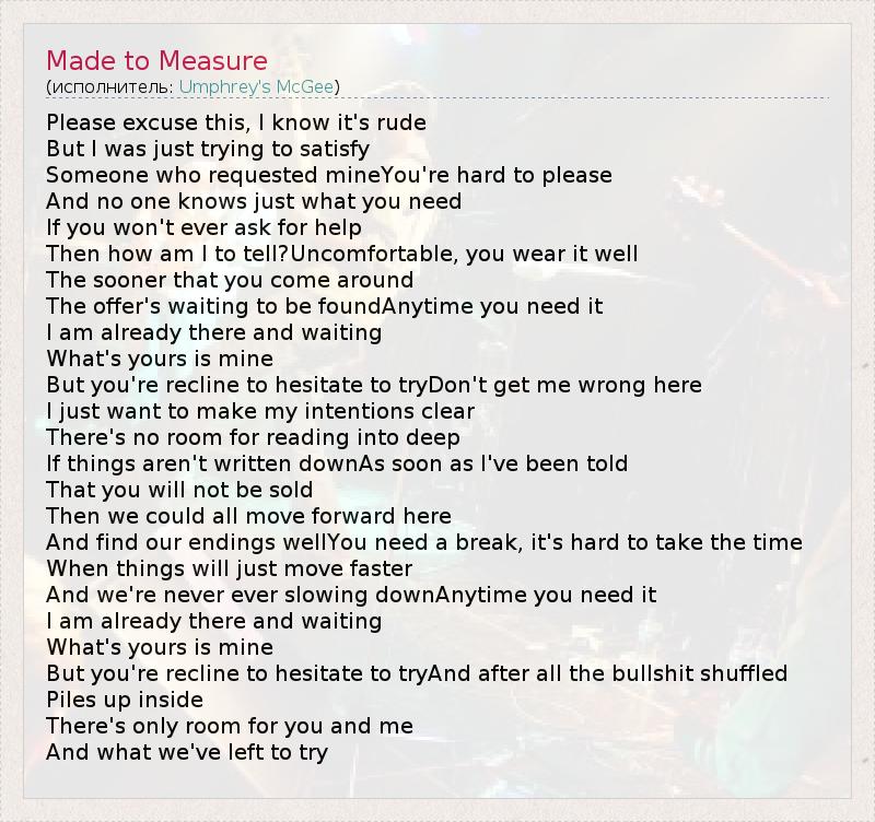 А как ты думаешь, о чем песня "Made to Measure" ?
