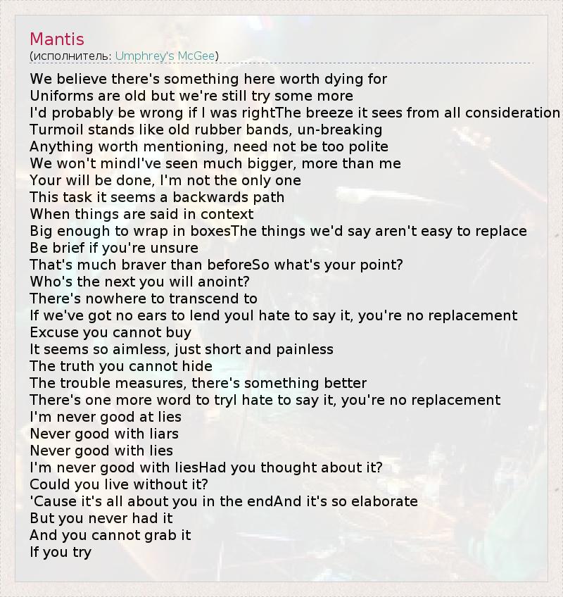 We believe there's something here worth dying for Uniforms are old but we're still try some more I'd probably be wrong if I was rightThe breeze it sees from all consideration Turmoil stands like old rubber bands, un-breaking Anything worth mentioning, need not be too polite We won't mindI've seen much bigger, more than me Your will be done, I'm not the only one This task it seems a backwards path When things are said in context Big enough to wrap in boxesThe things we'd say aren't easy to replace Be brief if you're unsure That's much braver than beforeSo what's your point? Who's the next you will anoint? There's nowhere to transcend to If we've got no ears to lend youI hate to say it, you're no replacement Excuse you cannot buy It seems so aimless, just short and painless The truth you cannot hide The trouble measures, there's something better There's one more word to tryI hate to say it, you're no replacement I'm never good at lies Never good with liars Never good with lies I'm never good with liesHad you thought about it? Could you live without it? 'Cause it's all about you in the endAnd it's so elaborate But you never had it And you cannot grab it If you try