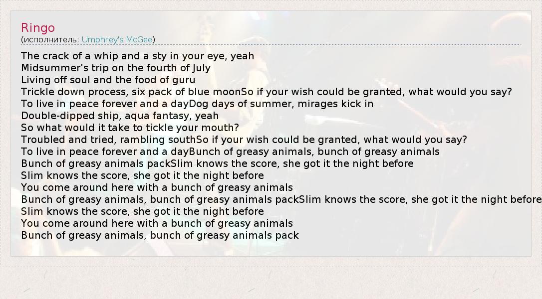 Это интересно:Umphrey's McGee is an American progressive rock band originally from South Bend, Indiana, whose music is often referred to as "progressive improvisation", or "improg". Although the band is part of the jam band scene, like Phish and the Grateful Dead (with ever-changing setlists, improvisation, two sets per night, open taping policy, etc.), they are much more influenced musically by progressive rock artists such as King Crimson, Yes, Pink Floyd, Frank Zappa, The Mahavishnu Orchestra, and early Genesis, as well as heavy metal bands such as Iron Maiden and Guns N' Roses. The band also identifies The Police, The Beatles, and Led Zeppelin as primary influences. UM experiments... продолжение