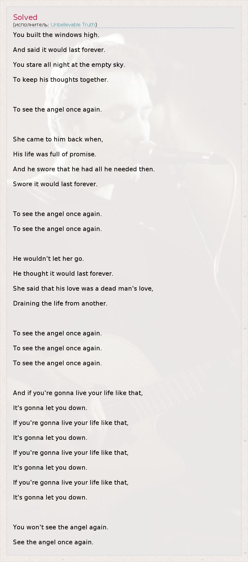 You built the windows high. And said it would last forever. You stare all night at the empty sky. To keep his thoughts together. To see the angel once again. She came to him back when, His life was full of promise. And he swore that he had all he needed then. Swore it would last forever. To see the angel once again. To see the angel once again. He wouldn't let her go. He thought it would last forever. She said that his love was a dead man's love, Draining the life from another. To see the angel once again. To see the angel once again. To see the angel once again. And if you're gonna live your life like that, It's gonna let you down. If you're gonna live your life like that, It's gonna let you down. If you're gonna live your life like that, It's gonna let you down. If you're gonna live your life like that, It's gonna let you down. You won't see the angel again. See the angel once again.