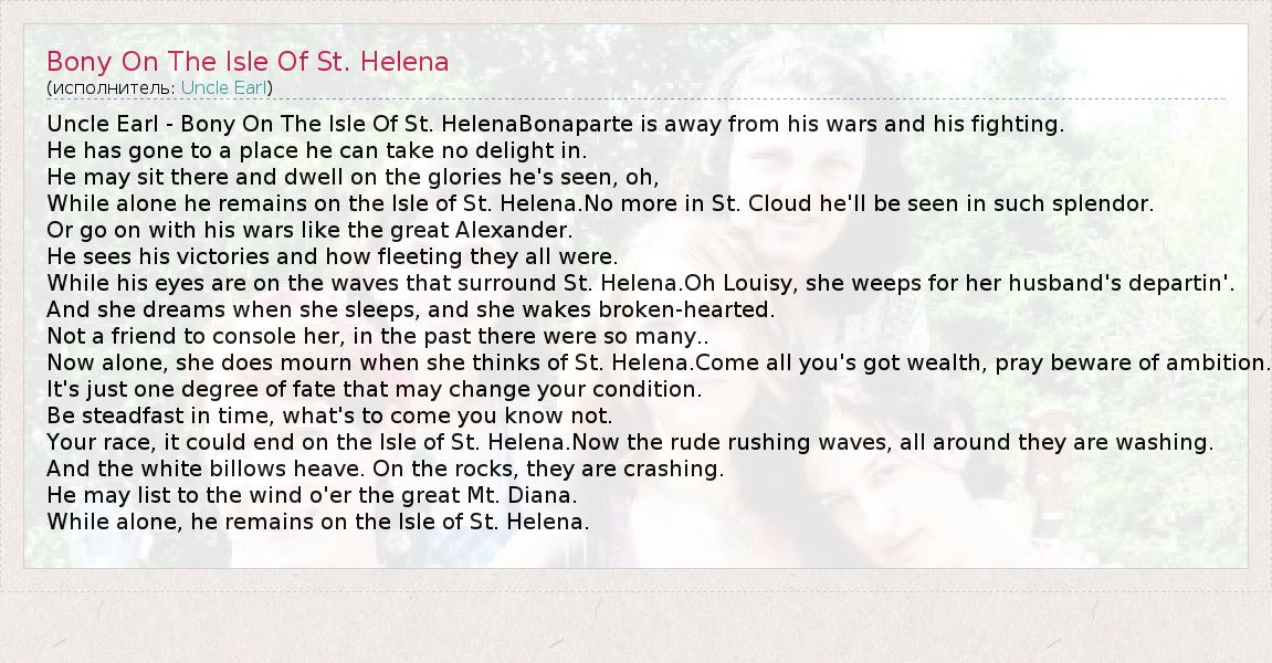 Uncle Earl - Bony On The Isle Of St. HelenaBonaparte is away from his wars and his fighting. He has gone to a place he can take no delight in. He may sit there and dwell on the glories he's seen, oh, While alone he remains on the Isle of St. Helena.No more in St. Cloud he'll be seen in such splendor. Or go on with his wars like the great Alexander. He sees his victories and how fleeting they all were. While his eyes are on the waves that surround St. Helena.Oh Louisy, she weeps for her husband's departin'. And she dreams when she sleeps, and she wakes broken-hearted. Not a friend to console her, in the past there were so many.. Now alone, she does mourn when she thinks of St. Helena.Come all you's got wealth, pray beware of ambition. It's just one degree of fate that may change your condition. Be steadfast in time, what's to come you know not. Your race, it could end on the Isle of St. Helena.Now the rude rushing waves, all around they are washing. And the white billows heave. On the rocks, they are crashing. He may list to the wind o'er the great Mt. Diana. While alone, he remains on the Isle of St. Helena.