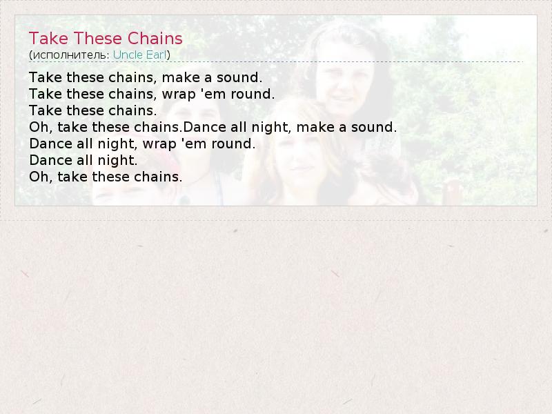 Take these chains, make a sound. Take these chains, wrap 'em round. Take these chains. Oh, take these chains.Dance all night, make a sound. Dance all night, wrap 'em round. Dance all night. Oh, take these chains.