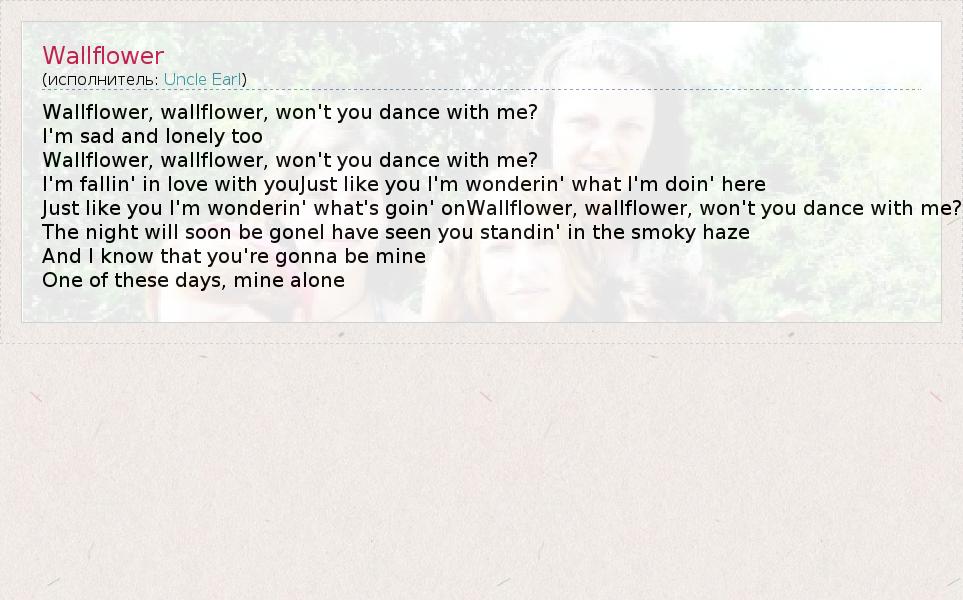 Just like you I'm wonderin' what's goin' onWallflower, wallflower, won't you dance with me?