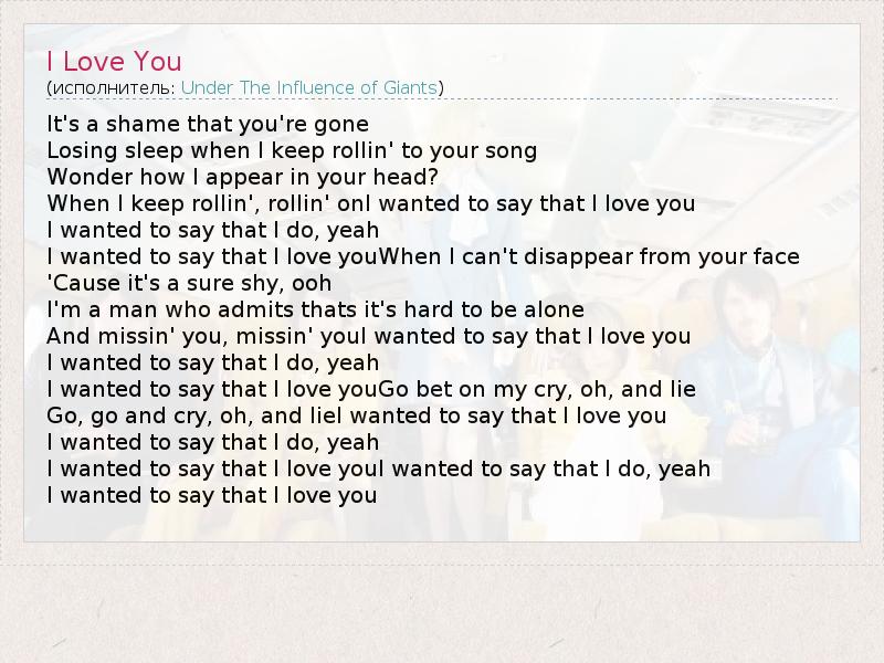 It's a shame that you're gone Losing sleep when I keep rollin' to your song Wonder how I appear in your head? When I keep rollin', rollin' onI wanted to say that I love you I wanted to say that I do, yeah I wanted to say that I love youWhen I can't disappear from your face 'Cause it's a sure shy, ooh I'm a man who admits thats it's hard to be alone And missin' you, missin' youI wanted to say that I love you I wanted to say that I do, yeah I wanted to say that I love youGo bet on my cry, oh, and lie Go, go and cry, oh, and lieI wanted to say that I love you I wanted to say that I do, yeah I wanted to say that I love youI wanted to say that I do, yeah I wanted to say that I love you