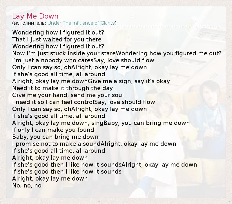 Wondering how I figured it out? That I just waited for you there Wondering how I figured it out? Now I'm just stuck inside your stareWondering how you figured me out? I'm just a nobody who caresSay, love should flow Only I can say so, ohAlright, okay lay me down If she's good all time, all around Alright, okay lay me downGive me a sign, say it's okay Need it to make it through the day Give me your hand, send me your soul I need it so I can feel controlSay, love should flow Only I can say so, ohAlright, okay lay me down If she's good all time, all around Alright, okay lay me down, singBaby, you can bring me down If only I can make you found Baby, you can bring me down I promise not to make a soundAlright, okay lay me down If she's good all time, all around Alright, okay lay me down If she's good then I like how it soundsAlright, okay lay me down If she's good then I like how it sounds Alright, okay lay me down No, no, no