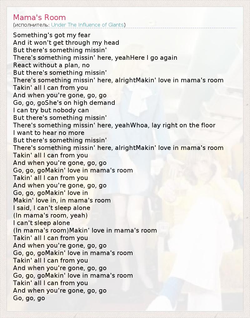 Something's got my fear And it won't get through my head But there's something missin' There's something missin' here, yeahHere I go again React without a plan, no But there's something missin' There's something missin' here, alrightMakin' love in mama's room Takin' all I can from you And when you're gone, go, go Go, go, goShe's on high demand I can try but nobody can But there's something missin' There's something missin' here, yeahWhoa, lay right on the floor I want to hear no more But there's something missin' There's something missin' here, alrightMakin' love in mama's room Takin' all I can from you And when you're gone, go, go Go, go, goMakin' love in mama's room Takin' all I can from you And when you're gone, go, go Go, go, goMakin' love in Makin' love in, in mama's room I said, I can't sleep alone (In mama's room, yeah) I can't sleep alone (In mama's room)Makin' love in mama's room Takin' all I can from you And when you're gone, go, go Go, go, goMakin' love in mama's room Takin' all I can from you And when you're gone, go, go Go, go, goMakin' love in mama's room Takin' all I can from you And when you're gone, go, go Go, go, go