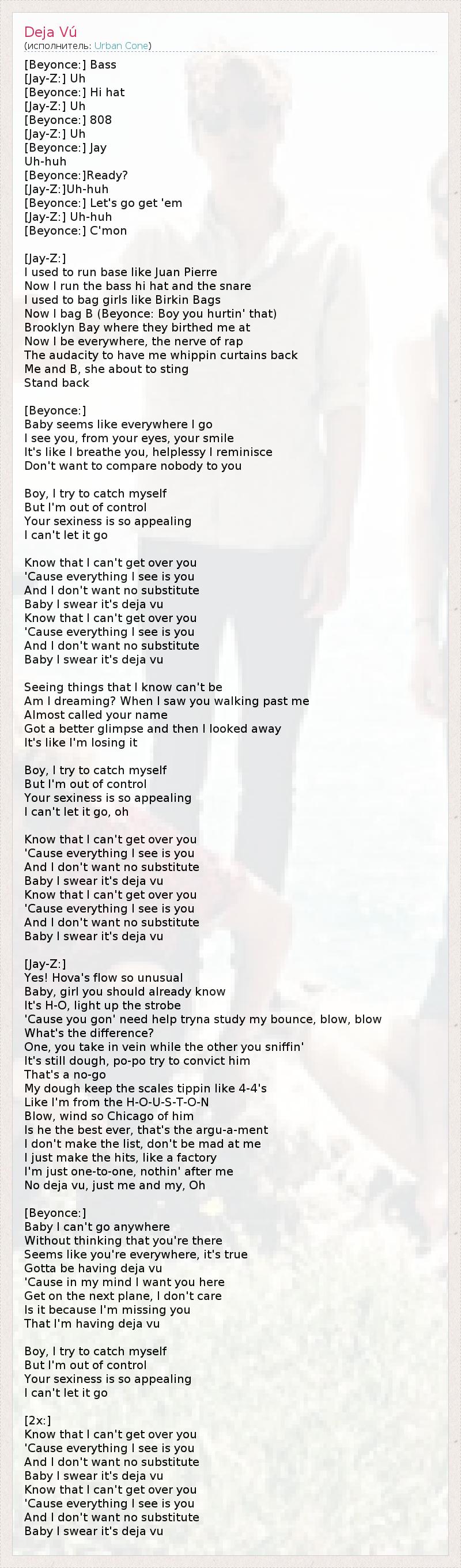 [Beyonce:] Bass [Jay-Z:] Uh [Beyonce:] Hi hat [Jay-Z:] Uh [Beyonce:] 808 [Jay-Z:] Uh [Beyonce:] Jay Uh-huh [Beyonce:]Ready? [Jay-Z:]Uh-huh [Beyonce:] Let's go get 'em [Jay-Z:] Uh-huh [Beyonce:] C'mon [Jay-Z:] I used to run base like Juan Pierre Now I run the bass hi hat and the snare I used to bag girls like Birkin Bags Now I bag B (Beyonce: Boy you hurtin' that) Brooklyn Bay where they birthed me at Now I be everywhere, the nerve of rap The audacity to have me whippin curtains back Me and B, she about to sting Stand back [Beyonce:] Baby seems like everywhere I go I see you, from your eyes, your smile It's like I breathe you, helplessy I reminisce Don't want to compare nobody to you Boy, I try to catch myself But I'm out of control Your sexiness is so appealing I can't let it go Know that I can't get over you 'Cause everything I see is you And I don't want no substitute Baby I swear it's deja vu Know that I can't get over you 'Cause everything I see is you And I don't want no substitute Baby I swear it's deja vu Seeing things that I know can't be Am I dreaming? When I saw you walking past me Almost called your name Got a better glimpse and then I looked away It's like I'm losing it Boy, I try to catch myself But I'm out of control Your sexiness is so appealing I can't let it go, oh Know that I can't get over you 'Cause everything I see is you And I don't want no substitute Baby I swear it's deja vu Know that I can't get over you 'Cause everything I see is you And I don't want no substitute Baby I swear it's deja vu [Jay-Z:] Yes! Hova's flow so unusual Baby, girl you should already know It's H-O, light up the strobe 'Cause you gon' need help tryna study my bounce, blow, blow What's the difference? One, you take in vein while the other you sniffin' It's still dough, po-po try to convict him That's a no-go My dough keep the scales tippin like 4-4's Like I'm from the H-O-U-S-T-O-N Blow, wind so Chicago of him Is he the best ever, that's the argu-a-ment I don't make the list, don't be mad at me I just make the hits, like a factory I'm just one-to-one, nothin' after me No deja vu, just me and my, Oh [Beyonce:] Baby I can't go anywhere Without thinking that you're there Seems like you're everywhere, it's true Gotta be having deja vu 'Cause in my mind I want you here Get on the next plane, I don't care Is it because I'm missing you That I'm having deja vu Boy, I try to catch myself But I'm out of control Your sexiness is so appealing I can't let it go [2x:] Know that I can't get over you 'Cause everything I see is you And I don't want no substitute Baby I swear it's deja vu Know that I can't get over you 'Cause everything I see is you And I don't want no substitute Baby I swear it's deja vu