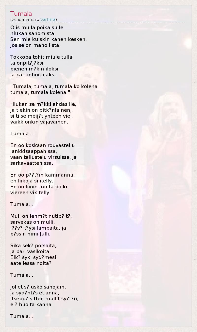 Это интересно:Värttinä, наиболее успешная современная фолк-группа Финляндии, известна благодаря факту изобретения вокально-инструментального стиля, основанного на национальных корнях, и не имеющего аналогов ни в Финляндии, ни вообще в мире. С лёгкостью смешивая древнюю финскую поэзию, характерные финно-угорские вокальные гармонии, традиционную и современную акустическую инструментовку, сложные и... продолжение