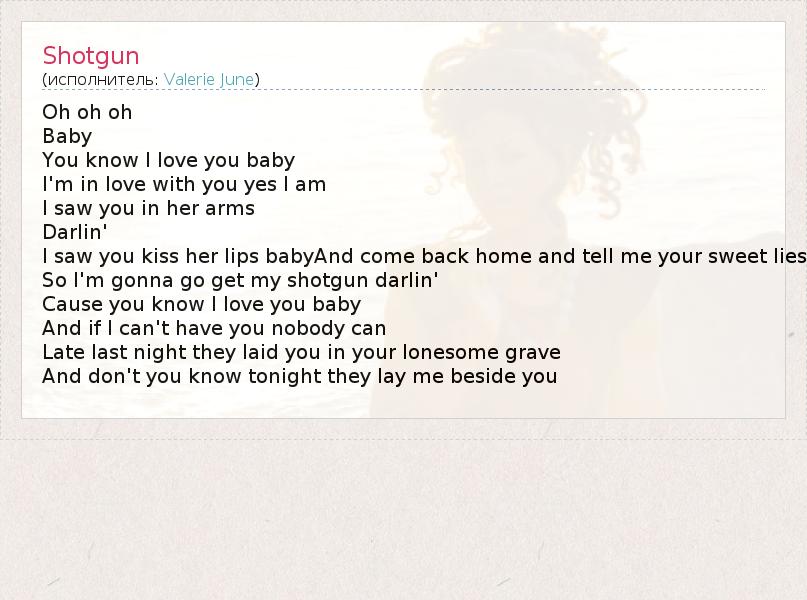 Oh oh oh Baby You know I love you baby I'm in love with you yes I am I saw you in her arms Darlin' I saw you kiss her lips babyAnd come back home and tell me your sweet lies So I'm gonna go get my shotgun darlin' Cause you know I love you baby And if I can't have you nobody can Late last night they laid you in your lonesome grave And don't you know tonight they lay me beside you
