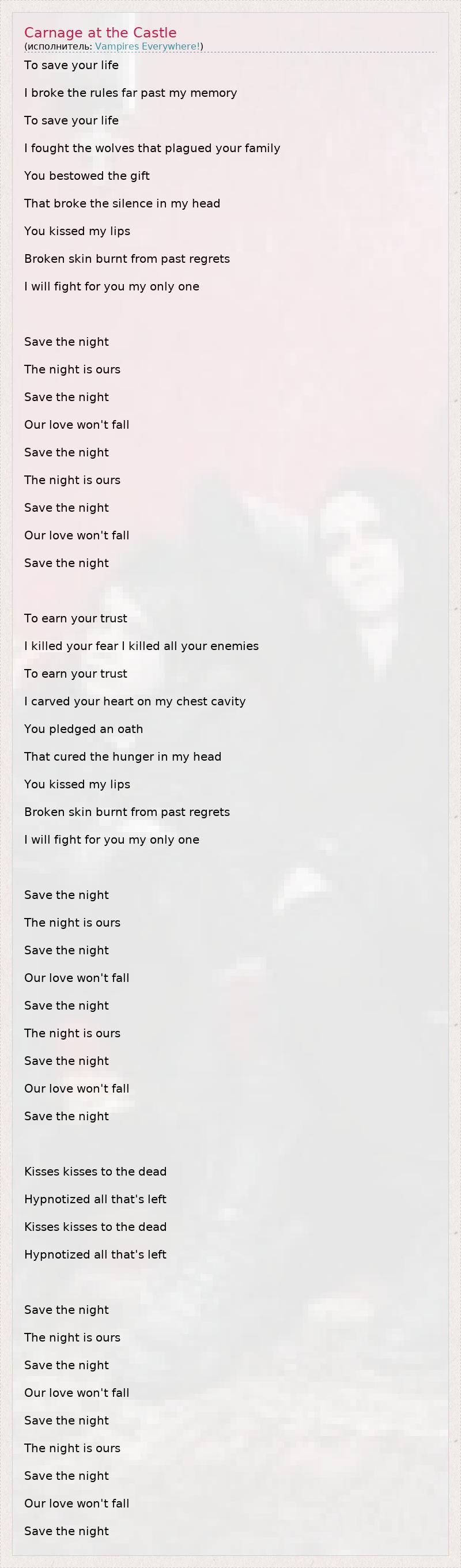 To save your life I broke the rules far past my memory To save your life I fought the wolves that plagued your family You bestowed the gift That broke the silence in my head You kissed my lips Broken skin burnt from past regrets I will fight for you my only one Save the night The night is ours Save the night Our love won't fall Save the night The night is ours Save the night Our love won't fall Save the night To earn your trust I killed your fear I killed all your enemies To earn your trust I carved your heart on my chest cavity You pledged an oath That cured the hunger in my head You kissed my lips Broken skin burnt from past regrets I will fight for you my only one Save the night The night is ours Save the night Our love won't fall Save the night The night is ours Save the night Our love won't fall Save the night Kisses kisses to the dead Hypnotized all that's left Kisses kisses to the dead Hypnotized all that's left Save the night The night is ours Save the night Our love won't fall Save the night The night is ours Save the night Our love won't fall Save the night