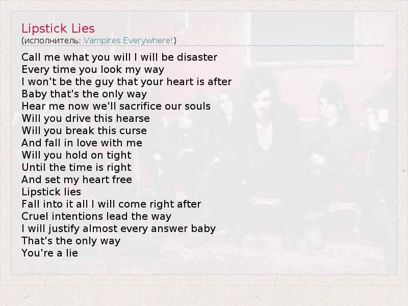Call me what you will I will be disaster Every time you look my way I won't be the guy that your heart is after Baby that's the only way Hear me now we'll sacrifice our souls Will you drive this hearse Will you break this curse And fall in love with me Will you hold on tight Until the time is right And set my heart free Lipstick lies Fall into it all I will come right after Cruel intentions lead the way I will justify almost every answer baby That's the only way You're a lie