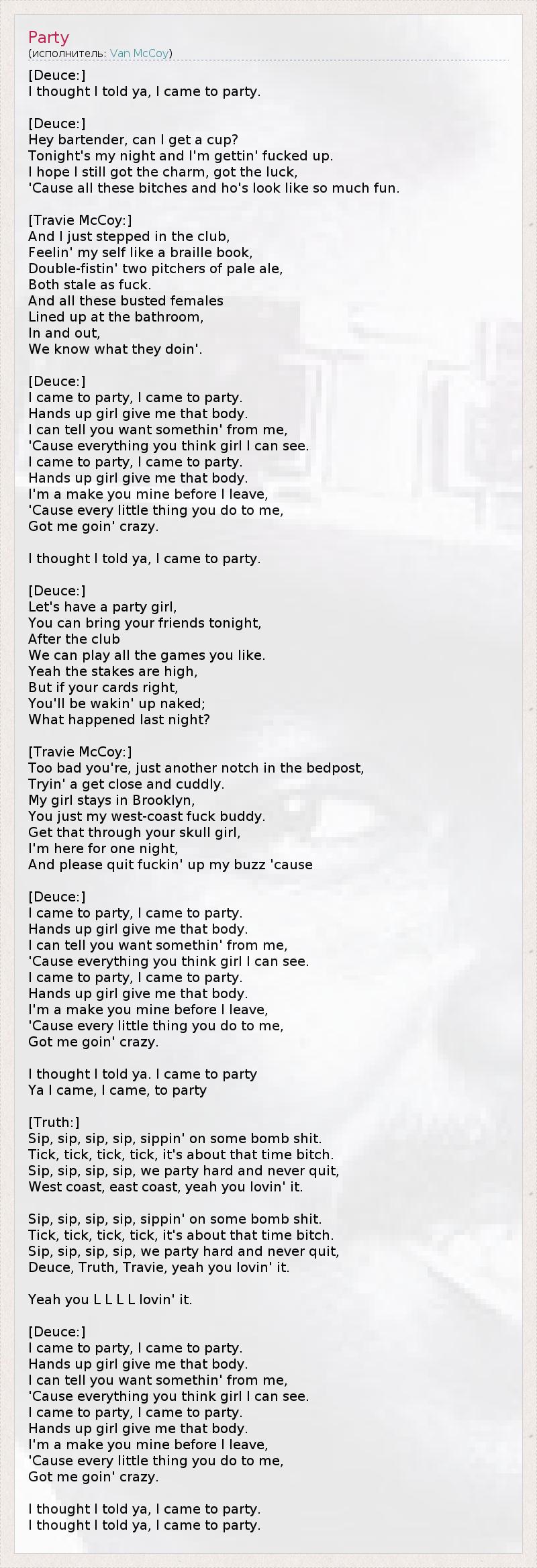 [Deuce:] Я думал, что сказал тебе: я пришёл на вечеринку! [Deuce:] Эй, бармен, налей мне стопку! Это моя ночь, и я собираюсь хорошенько нажраться. Надеюсь, что я по-прежнему очаровательный счастливчик, Потому что с этими сучками и шлюшками я могу хорошо позабавиться! [Travie McCoy:] Как только я вошёл в клуб, Я почувствовал себя книгой Брайля. 1 Сделал фистинг двум гомикам - они кончили в пиво, 2 Они оба были п**дец какие старые. И все эти страшные тёлки 3 Выстроились у туалета; Входят и выходят. Мы все знаем, чем они занимаются. [Deuce:] Я пришёл на вечеринку, я пришёл на вечеринку! Руки вверх, детка! Покрути своим телом! 4 Ты ведь чего-то от меня хочешь - Я могу прочитать все твои мысли. Я пришёл на вечеринку, я пришёл на вечеринку! Руки вверх, детка! Покрути своим телом! Я овладею тобой прежде, чем уйду, Потому что всё, что ты со мной делаешь, Сводит меня с ума! Я думал, что сказал тебе: я пришёл на вечеринку! [Deuce:] Детка, давай устроим вечеринку, Ты можешь привести своих друзей. Когда покинем клуб, Мы можем поиграть в любые игры, какие ты пожелаешь. Да, ставки высоки, Но если у тебя хорошие карты, Наутро ты проснёшься голой. Что происходило прошлой ночью? [Travie McCoy]: Очень жаль, что ты - лишь ещё одна отметка в моём списке. 5 Пытаешься быть милой и понравиться мне. Моя девушка сейчас в Бруклине, Ты - просто мой секс-друг на Западном побережье. Осознай это, детка, Я ведь здесь всего на одну ночь. И, пожалуйста, прекрати меня спаивать, ведь... [Deuce:] Я пришёл на вечеринку, я пришёл на вечеринку! Руки вверх, детка! Покрути своим телом! Ты ведь чего-то от меня хочешь - Я могу прочитать все твои мысли. Я пришёл на вечеринку, я пришёл на вечеринку! Руки вверх, детка! Покрути своим телом! Я овладею тобой прежде, чем уйду, Потому что всё, что ты со мной делаешь, Сводит меня с ума! Я думал, что сказал тебе: я пришёл на вечеринку! Да, я пришёл, я пришёл на вечеринку! [Truth:] Пей, пей, пей, пей, пей, эта хрень тебя точно вынесет! Тик, тик, тик, тик - настало время, с*чка! Пей, пей, пей, пей. Мы отрываемся и никогда не прекратим! Западное побережье, восточное побережье, да, вы все любите это! Пей, пей, пей, пей, пей, эта хрень тебя точно вынесет! Тик, тик, тик, тик - настало время, с*чка! Пей, пей, пей, пей. Мы отрываемся и никогда не прекратим! Deuce, Thruth, Travie - вы все любите это! Да, вы л-л-л-л-любите это! [Deuce:] Я пришёл на вечеринку, я пришёл на вечеринку! Руки вверх, детка! Покрути своим телом! Ты ведь чего-то от меня хочешь - Я могу прочитать все твои мысли. Я пришёл на вечеринку, я пришёл на вечеринку! Руки вверх, детка! Покрути своим телом! Я овладею тобой прежде, чем уйду, Потому что всё, что ты со мной делаешь, Сводит меня с ума! Я думал, что сказал тебе: я пришёл на вечеринку! Я думал, что сказал тебе: я пришёл на вечеринку! 1 - Книга Брайля - книга для незрячих людей. Они читают её посредством прикосновений. Треви имел в виду, что он вошёл в клуб, и его всего облапали. 2 - Фистинг - сексуальная практика, подразумевающая введение пальцев или кулака в анус или вагину. Pitches (сленг) - мужчины-проституты. Pale Ale (сленг) - эякуляция в стакан с выпивкой. 3 - Busted females (сленг) - страшные женщины. Внешне они скорее напоминают мужчин, чем представительниц прекрасного пола. Такие девушки легко разводятся на секс на вечеринке. 4 - Фраза построена по аналогии с речью грабителя: "Hands up! Give me that money!". То есть дословно эту фразу можно перевести как "Руки вверх! Гони сюда своё тело!". 5 - Notch 