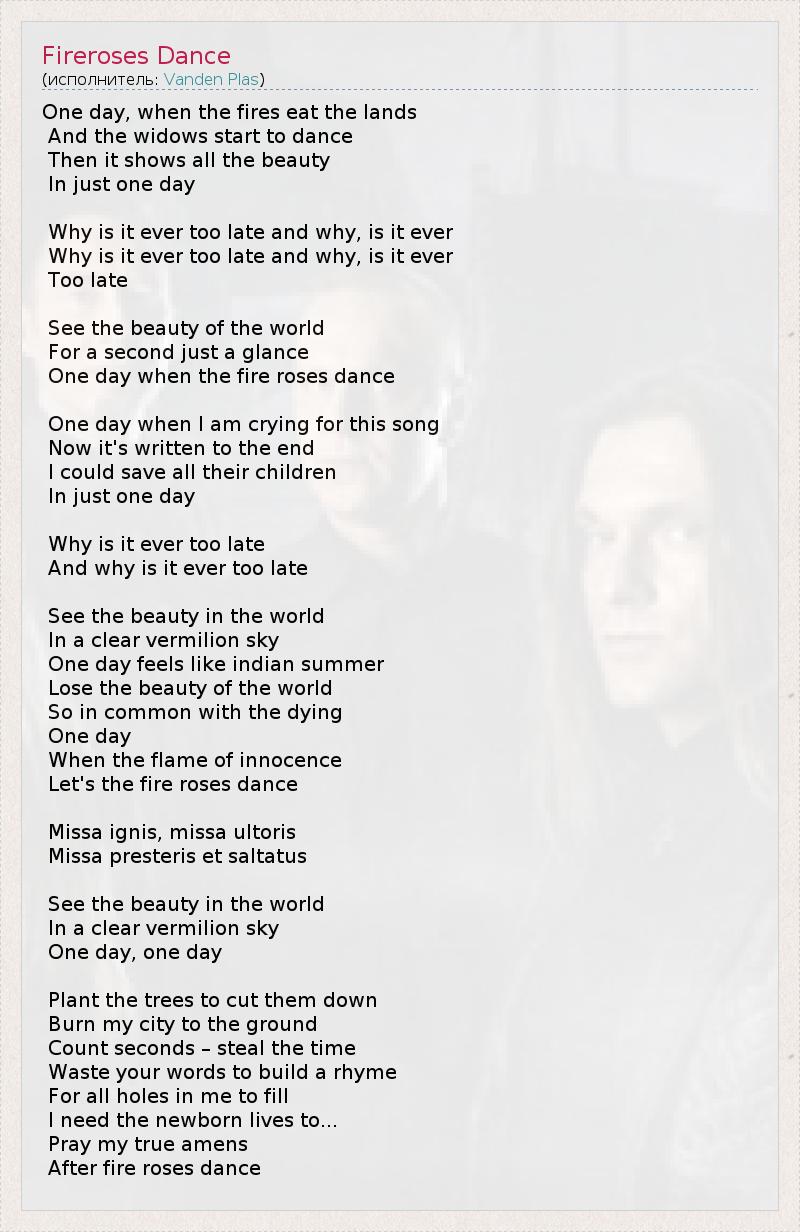 One day, when the fires eat the lands And the widows start to dance Then it shows all the beauty In just one day Why is it ever too late and why, is it ever Why is it ever too late and why, is it ever Too late See the beauty of the world For a second just a glance One day when the fire roses dance One day when I am crying for this song Now it's written to the end I could save all their children In just one day Why is it ever too late And why is it ever too late See the beauty in the world In a clear vermilion sky One day feels like indian summer Lose the beauty of the world So in common with the dying One day When the flame of innocence Let's the fire roses dance Missa ignis, missa ultoris Missa presteris et saltatus See the beauty in the world In a clear vermilion sky One day, one day Plant the trees to cut them down Burn my city to the ground Count seconds – steal the time Waste your words to build a rhyme For all holes in me to fill I need the newborn lives to... Pray my true amens After fire roses dance