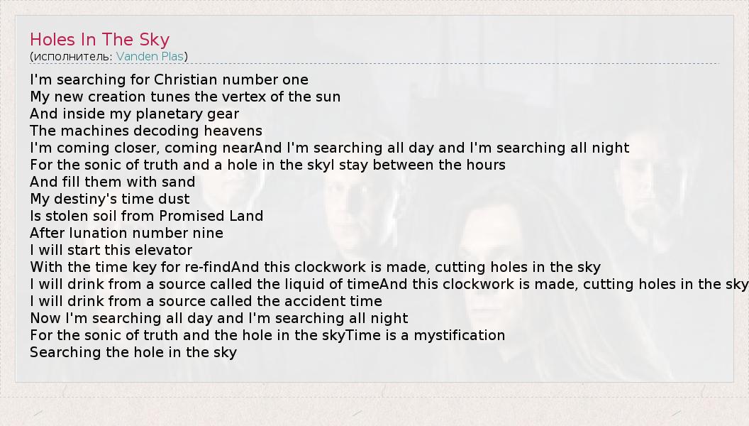I'm searching for Christian number one My new creation tunes the vertex of the sun And inside my planetary gear The machines decoding heavens I'm coming closer, coming nearAnd I'm searching all day and I'm searching all night For the sonic of truth and a hole in the skyI stay between the hours And fill them with sand My destiny's time dust Is stolen soil from Promised Land After lunation number nine I will start this elevator With the time key for re-findAnd this clockwork is made, cutting holes in the sky I will drink from a source called the liquid of timeAnd this clockwork is made, cutting holes in the sky I will drink from a source called the accident time Now I'm searching all day and I'm searching all night For the sonic of truth and the hole in the skyTime is a mystification Searching the hole in the sky
