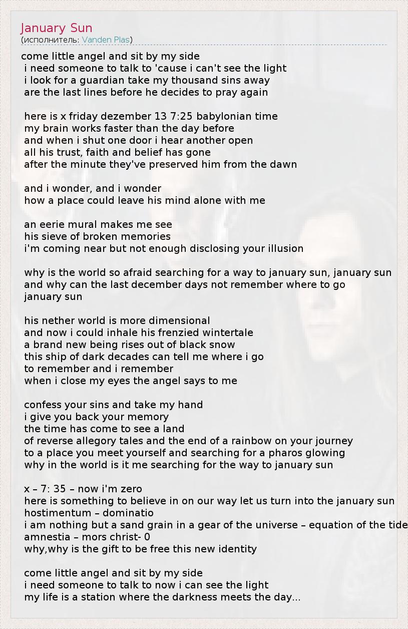 come little angel and sit by my side i need someone to talk to 'cause i can't see the light i look for a guardian take my thousand sins away are the last lines before he decides to pray again here is x friday dezember 13 7:25 babylonian time my brain works faster than the day before and when i shut one door i hear another open all his trust, faith and belief has gone after the minute they've preserved him from the dawn and i wonder, and i wonder how a place could leave his mind alone with me an eerie mural makes me see his sieve of broken memories i'm coming near but not enough disclosing your illusion why is the world so afraid searching for a way to january sun, january sun and why can the last december days not remember where to go january sun his nether world is more dimensional and now i could inhale his frenzied wintertale a brand new being rises out of black snow this ship of dark decades can tell me where i go to remember and i remember when i close my eyes the angel says to me confess your sins and take my hand i give you back your memory the time has come to see a land of reverse allegory tales and the end of a rainbow on your journey to a place you meet yourself and searching for a pharos glowing why in the world is it me searching for the way to january sun x – 7: 35 – now i'm zero here is something to believe in on our way let us turn into the january sun hostimentum – dominatio i am nothing but a sand grain in a gear of the universe – equation of the tide amnestia – mors christ- 0 why,why is the gift to be free this new identity come little angel and sit by my side i need someone to talk to now i can see the light my life is a station where the darkness meets the day...