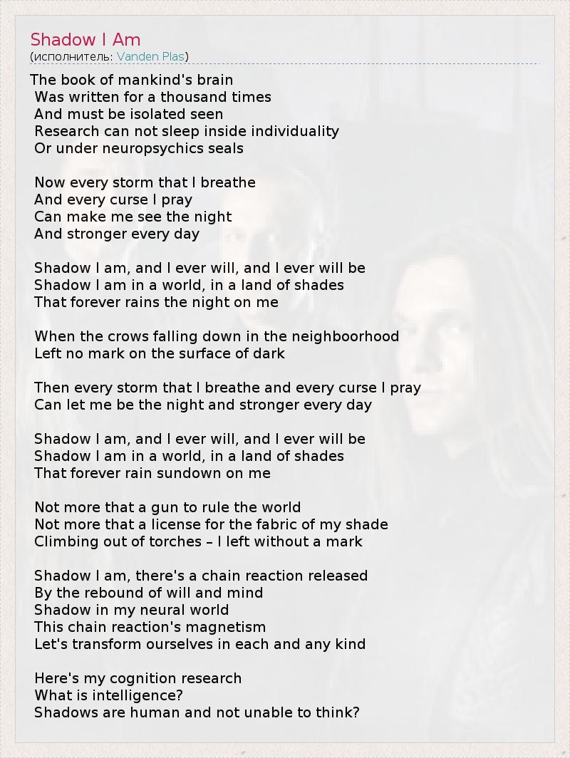 The book of mankind's brain Was written for a thousand times And must be isolated seen Research can not sleep inside individuality Or under neuropsychics seals Now every storm that I breathe And every curse I pray Can make me see the night And stronger every day Shadow I am, and I ever will, and I ever will be Shadow I am in a world, in a land of shades That forever rains the night on me When the crows falling down in the neighboorhood Left no mark on the surface of dark Then every storm that I breathe and every curse I pray Can let me be the night and stronger every day Shadow I am, and I ever will, and I ever will be Shadow I am in a world, in a land of shades That forever rain sundown on me Not more that a gun to rule the world Not more that a license for the fabric of my shade Climbing out of torches – I left without a mark Shadow I am, there's a chain reaction released By the rebound of will and mind Shadow in my neural world This chain reaction's magnetism Let's transform ourselves in each and any kind Here's my cognition research What is intelligence? Shadows are human and not unable to think?