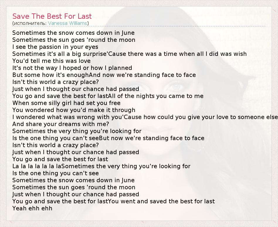 А как ты думаешь, о чем песня "Save The Best For Last" ?