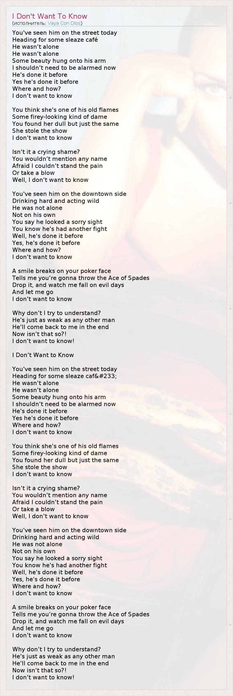 Ты видела его на сегодня улице, Направляющимся в одно дешёвое кафе. Он был не один, Он был не один, Какая-то красотка висела у него на руке. Но я не должна беспокоиться, Он делал это и раньше, Да, он делал это и раньше, Где и как? Я не хочу знать. Ты думаешь, что это одна из прежних подруг? Такая яркая дама. Ты находишь ее скучной, но все равно Она заткнула меня за пояс, Я не хочу знать. Разве это не чудовищный позор? Ты не вспоминала никакие имена, Боясь, что я не выдержу эту боль, Не смогу принять удар, Ну, я не хочу знать. Ты видела его в центре города Очень пьяным и агрессивным. Он был не один, Не сам по себе. Ты говоришь, он был жалким зрелищем. Знаешь, он опять подрался. Ну, он делал это и раньше, Да, он делал это и раньше, Где и как? Я не хочу знать. Улыбка пробивается на твоём непроницаемом лице, Говоря мне, что ты собираешься пойти тузом пик. Валяй! И смотри, как я падаю в пучину злых дней, Дай мне уйти, Я не хочу знать. Почему я не пытаюсь понять? Он так же слаб, как и любой другой человек Он вернётся ко мне, в конце концов, Ну же, разве это не так?! Я не хочу знать! Не хочется знать (перевод Евгений Рыбаченко из Братска) ...в кафе горит огонь витрин, и нет для ревности причин, он был не один, он был не один, другую... обнимал рукой и что-то говорил другой, он вечно такой, да, он вечно такой, с кем он опять... не хочется знать, и, может быть, конечно, он с подругой из былых времён, она скучна со всех сторон, и это опять не хочется знать, и нервы рвутся, как струна, позор такой терпеть должна, и помнить чьи-то имена, и чью-то мать, но, не хочется знать, он с кем-то там сидел опять, был пьян и снова чья-то мать, он был не один, и пьян без причин, и жизнь даёт урок простой, что вся она, как вечный бой, и он вечно такой, да, он вечно такой, с кем он опять... не хочется знать, и снова в картах выпал шут, и снова где-то вдаль пошлют, и снова чёрт какой-то тут, и чья-то мать, не хочется знать, у каждой жизни путь кривой, он слаб, как и любой другой, но пусть вернётся он домой, придёт ли опять... не хочется знать... *Вольный перевод для женского вокала.