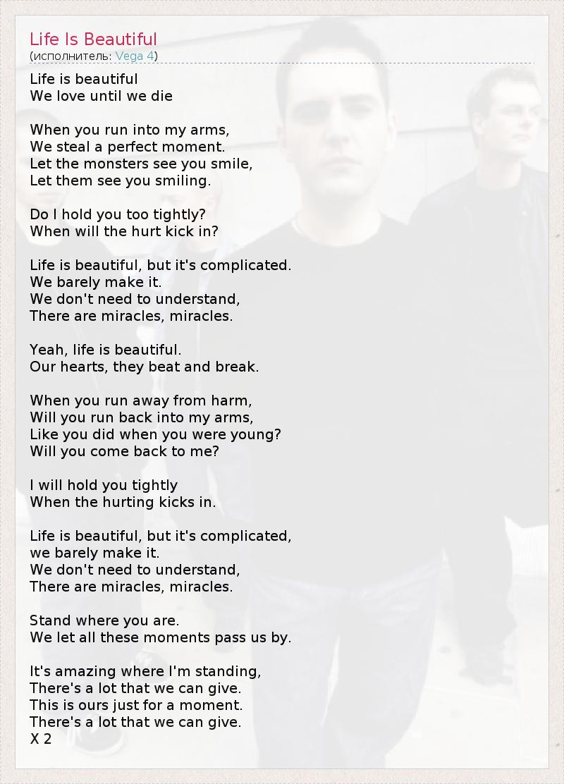 Жизнь прекрасна Мы любим, пока не умрём Когда ты бежишь в мои объятия, Мы крадем прекрасный момент. Позволь монстрам увидеть, что ты улыбаешься, Позволь им увидеть твою улыбку. Обнимаю ли я тебя слишком крепко? Когда же эта боль умрёт? Жизнь прекрасна, но так сложна. Мы с трудом справляемся с ней. Мы не должны всё понимать, Ведь в мире есть чудеса, чудеса. Да, жизнь прекрасна. Наши сердца бьются и разбиваются. Когда ты убегаешь от зла, Вернёшься ли ты в мои объятия, Как ты делала, когда ты была молода? Вернёшься ли ко мне? Я буду крепко обнимать тебя Когда боль будет умирать. Жизнь прекрасна, но так сложна. Мы с трудом справляемся с ней. Мы не должны всё понимать, Ведь в мире есть чудеса, чудеса. Стою там, где ты. Мы позволяем всем этим моментам проходить мимо нас. Удивительно, где я стою, Мы так много можем дать. Это наше только на мгновение. Мы так много можем дать. X 2