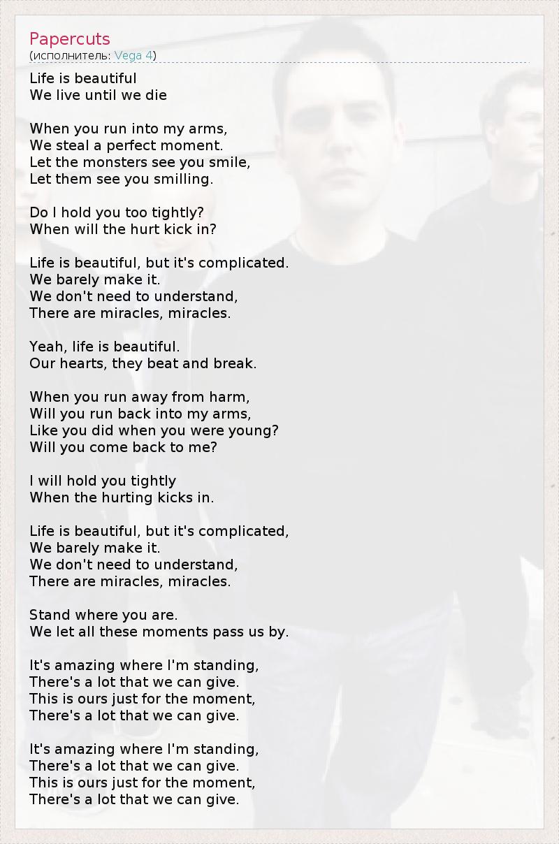 Life is beautiful We live until we die When you run into my arms, We steal a perfect moment. Let the monsters see you smile, Let them see you smilling. Do I hold you too tightly? When will the hurt kick in? Life is beautiful, but it's complicated. We barely make it. We don't need to understand, There are miracles, miracles. Yeah, life is beautiful. Our hearts, they beat and break. When you run away from harm, Will you run back into my arms, Like you did when you were young? Will you come back to me? I will hold you tightly When the hurting kicks in. Life is beautiful, but it's complicated, We barely make it. We don't need to understand, There are miracles, miracles. Stand where you are. We let all these moments pass us by. It's amazing where I'm standing, There's a lot that we can give. This is ours just for the moment, There's a lot that we can give. It's amazing where I'm standing, There's a lot that we can give. This is ours just for the moment, There's a lot that we can give.